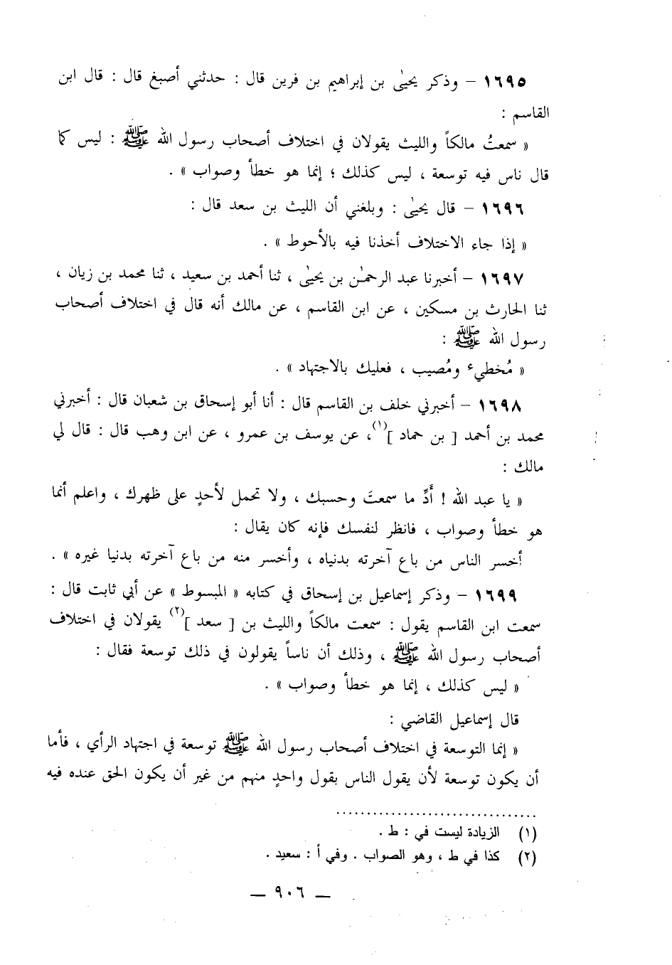 1699 - وَذَكَرَ إِسْمَاعِيلُ بْنُ إِسْحَاقَ فِي كِتَابِهِ الْمَبْسُوطِ، عَنْ أَبِي ثَابِتٍ قَالَ: سَمِعْتُ ابْنَ الْقَاسِمِ يَقُولُ: سَمِعْتُ مَالِكًا وَاللَّيْثَ بْنَ سَعْدٍ، يَقُولَانِ فِي §اخْتِلَافِ أَصْحَابِ رَسُولِ اللَّهِ صَلَّى اللَّهُ عَلَيْهِ وَسَلَّمَ وَذَلِكَ أَنَّ أُنَاسًا يَقُولُونَ: فِي ذَلِكَ تَوْسِعَةٌ فَقَالَ: «لَيْسَ كَذَلِكَ إِنَّمَا هُوَ خَطَأٌ وَصَوَابٌ» قَالَ إِسْمَاعِيلُ الْقَاضِي: إِنَّمَا التَّوْسِعَةُ فِي اخْتِلَافِ أَصْحَابِ رَسُولِ اللَّهِ صَلَّى اللَّهُ عَلَيْهِ وَسَلَّمَ تَوْسِعَةٌ فِي اجْتِهَادِ الرَّأْيِ فَأَمَّا أَنْ يَكُونَ تَوْسِعَةً لِأَنْ يَقُولَ النَّاسُ بِقَوْلٍ وَاحِدٍ مِنْهُمْ مِنْ غَيْرِ أَنْ يَكُونَ الْحَقُّ عِنْدَهُ فِيهِ -[907]- فَلَا وَلَكِنَّ اخْتِلَافَهُمْ يَدُلُّ عَلَى أَنَّهُمُ اجْتَهَدُوا فَاخْتَلَفُوا. قَالَ أَبُو عُمَرَ: كَلَامُ إِسْمَاعِيلَ هَذَا حَسَنٌ جِدًّا