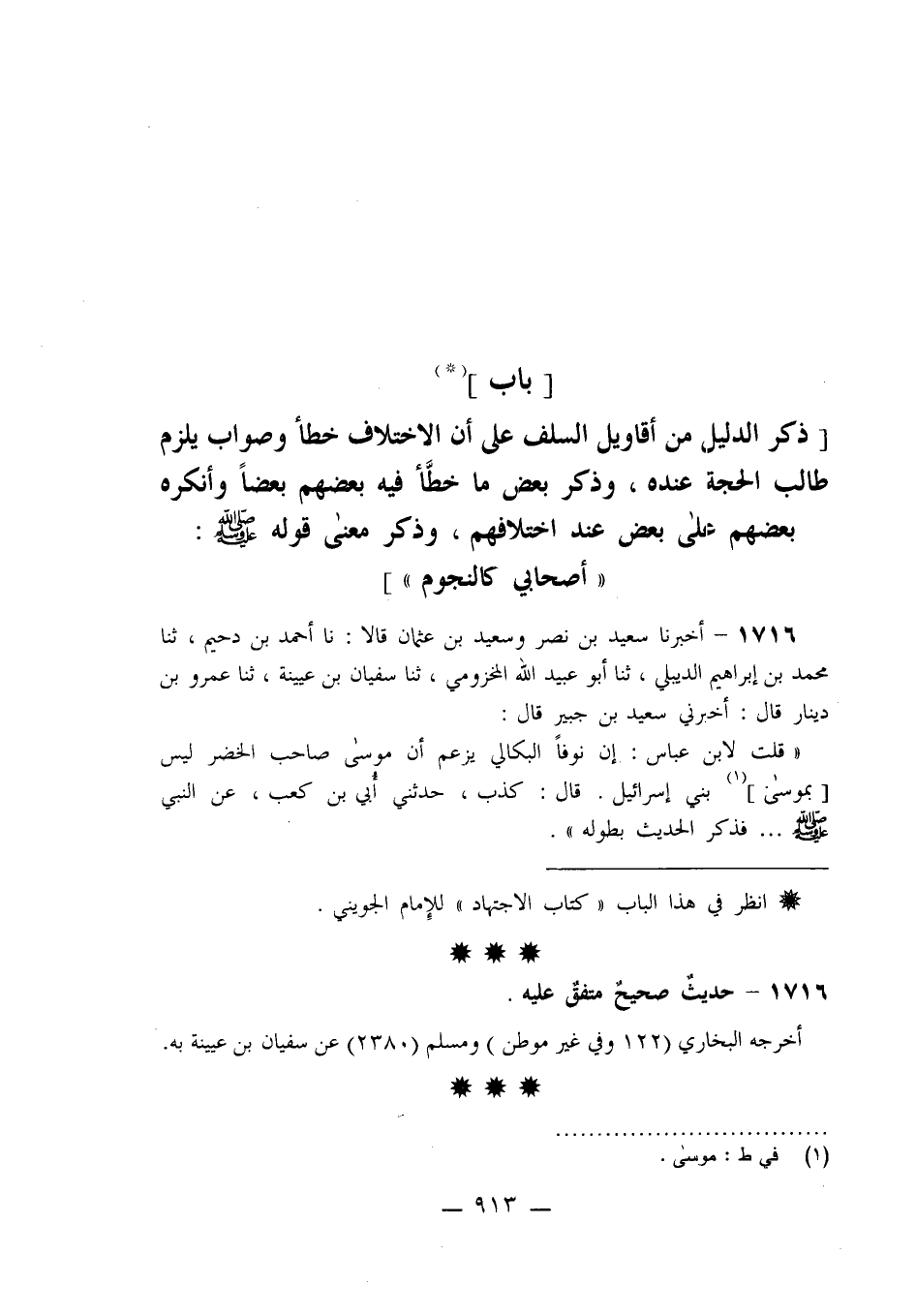 §بَابُ ذِكْرِ الدَّلِيلِ مِنْ أَقَاوِيلِ السَّلَفِ عَلَى أَنَّ الِاخْتِلَافَ خَطَأٌ وَصَوَابٌ «يَلْزَمُ طَالِبُ الْحُجَّةِ عِنْدَهُ، وَذِكْرُ بَعْضِ مَا خَطَّأَ فِيهِ بَعْضُهُمْ بَعْضًا وَأَنْكَرَهُ بَعْضُهُمْ عَلَى بَعْضٍ عِنْدَ اخْتِلَافِهِمْ، وَذِكْرُ مَعْنَى قَوْلِهِ صَلَّى اللَّهُ عَلَيْهِ وَسَلَّمَ» أَصْحَابِي كَالنُّجُومِ "