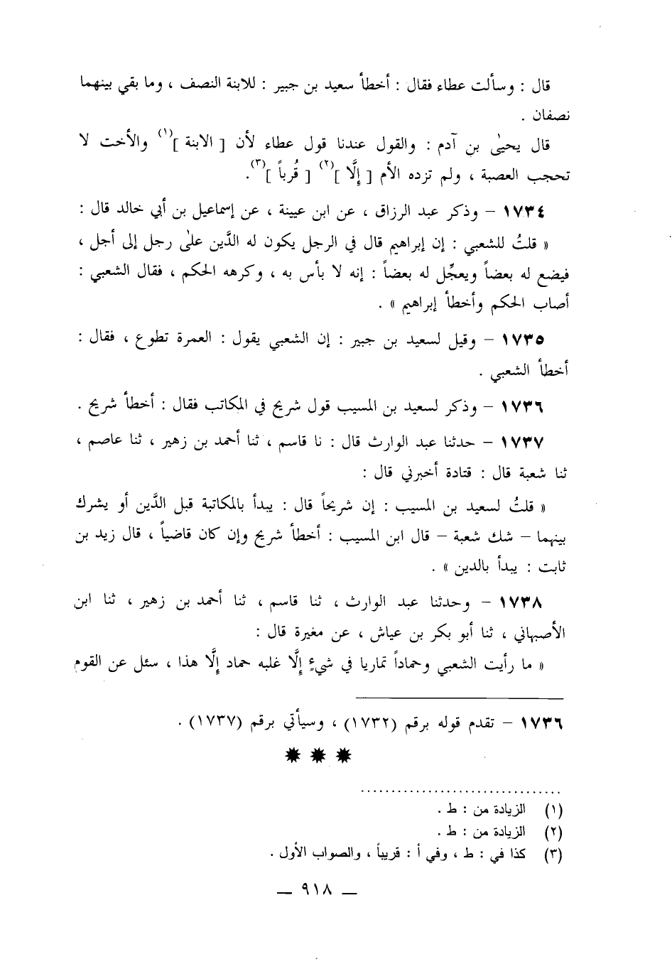 1735 - وَقِيلَ لِسَعِيدِ بْنِ جُبَيْرٍ: " إِنَّ الشَّعْبِيَّ يَقُولُ: الْعُمْرَةُ تَطَوُّعٌ، فَقَالَ: أَخْطَأَ الشَّعْبِيُّ "،