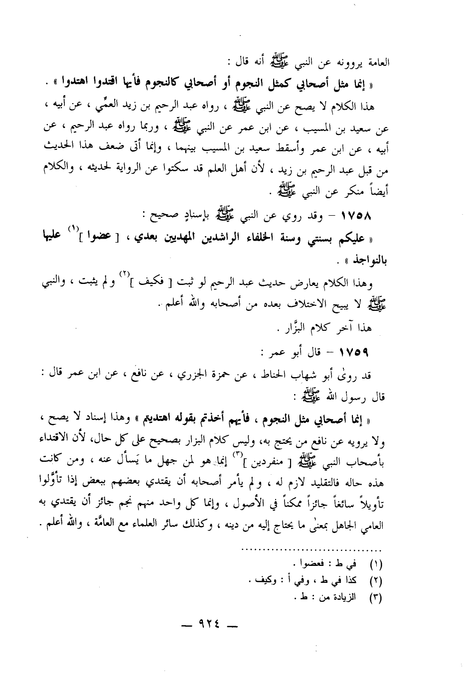 1759 - قَالَ أَبُو عُمَرَ: قَدْ رَوَى أَبُو شِهَابٍ الْحَنَّاطُ، عَنْ حَمْزَةَ الْجَزَرِيِّ، عَنْ نَافِعٍ، عَنِ ابْنِ عُمَرَ قَالَ: قَالَ رَسُولُ اللَّهِ صَلَّى اللَّهُ عَلَيْهِ وَسَلَّمَ: «إِنَّمَا §أَصْحَابِي مِثْلُ النُّجُومِ فَبِأَيِّهِمْ أَخَذْتُمْ بِقَوْلِهِ اهْتَدَيْتُمْ» وَهَذَا إِسْنَادٌ لَا يَصِحُّ، وَلَا يَرْوِيهِ عَنْ نَافِعٍ مَنْ يُحْتَجُّ بِهِ وَلَيْسَ كَلَامُ الْبَزَّارِ بِصَحِيحٍ عَلَى كُلِّ حَالٍ؛ لِأَنَّ الِاقْتِدَاءَ بِأَصْحَابِ النَّبِيِّ صَلَّى اللَّهُ عَلَيْهِ وَسَلَّمَ مُنْفَرِدِينَ إِنَّمَا هُوَ لَمِنْ جَهِلَ مَا يَسْأَلُ عَنْهُ، وَمَنْ كَانَتْ هَذِهِ حَالُهُ فَالتَّقْلِيدُ لَازِمٌ لَهُ وَلَمْ يَأْمُرْ أَصْحَابَهُ أَنْ يَقْتَدِيَ بَعْضُهُمْ بِبَعْضٍ إِذَا تَأَوَّلُوا تَأْوِيلًا سَائِغًا جَائِزًا مُمْكِنًا فِي الْأُصُولِ، وَإِنَّمَا كُلُّ وَاحِدٍ مِنْهُمْ نَجْمٌ جَائِزٌ أَنْ يَقْتَدِيَ بِهِ الْعَامِّيُّ الْجَاهِلُ بِمَعْنَى مَا يَحْتَاجُ إِلَيْهِ مِنْ دِينِهِ وَكَذَلِكَ سَائِرُ الْعُلَمَاءِ مَعَ الْعَامَّةِ وَاللَّهُ أَعْلَمُ، -[925]- وَقَدْ رُوِيَ فِي هَذَا الْحَدِيثِ إِسْنَادٌ غَيْرُ مَا ذَكَرَ الْبَزَّارُ "