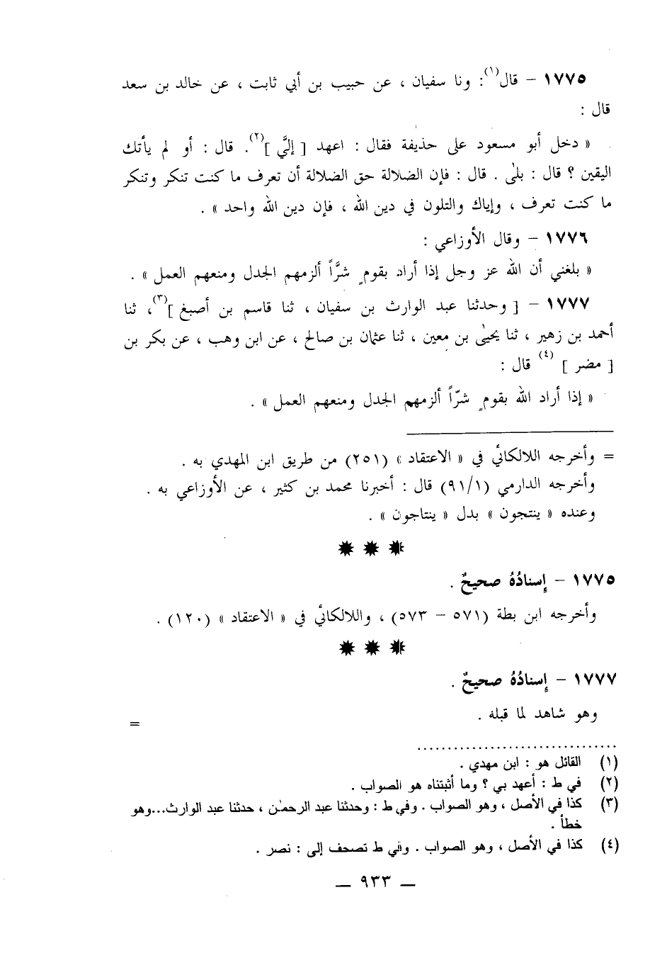 1775 - قَالَ: وَنا سُفْيَانُ، عَنْ حَبِيبِ بْنِ أَبِي ثَابِتٍ، عَنْ خَالِدِ بْنِ سَعْدٍ قَالَ: دَخَلَ أَبُو مَسْعُودٍ عَلَى حُذَيْفَةَ فَقَالَ: اعْهِدْ إِلَيَّ، قَالَ: أَوَلَمْ يَأْتِكَ الْيَقِينُ؟ قَالَ: بَلَى فَإِنَّ §الضَّلَالَةَ حَقٌّ الضَّلَالَةِ أَنْ تَعْرِفَ مَا كُنْتَ تُنْكِرُ، وَتُنْكِرَ مَا كُنْتَ تَعْرِفُ، وَإِيَّاكَ وَالتَّلَوُّنَ فِي دِينِ اللَّهِ؛ فَإِنَّ دِينَ اللَّهِ وَاحِدٌ "،