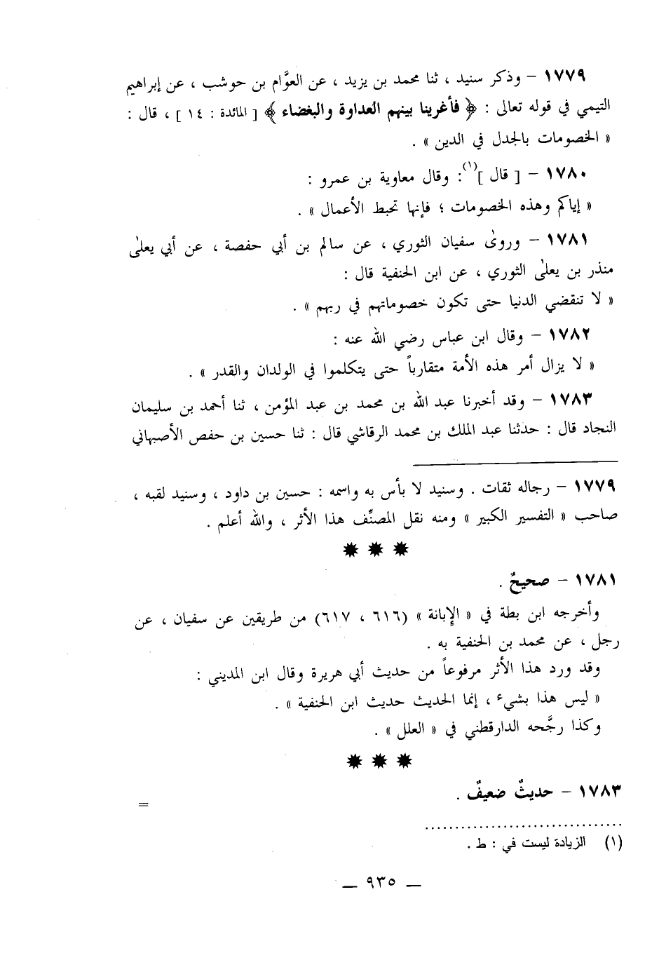 1779 - وَذَكَرَ سُنَيْدٌ، ثنا مُحَمَّدُ بْنُ يَزِيدَ، عَنِ الْعَوَّامِ بْنِ حَوْشَبٍ، عَنْ إِبْرَاهِيمَ التَّيْمِيِّ فِي قَوْلِهِ تَعَالَى {§فَأَغْرَيْنَا بَيْنَهُمُ الْعَدَاوَةَ وَالْبَغْضَاءَ} [المائدة: 14] قَالَ: «الْخُصُومَاتُ بِالْجَدَلِ فِي الدِّينِ»