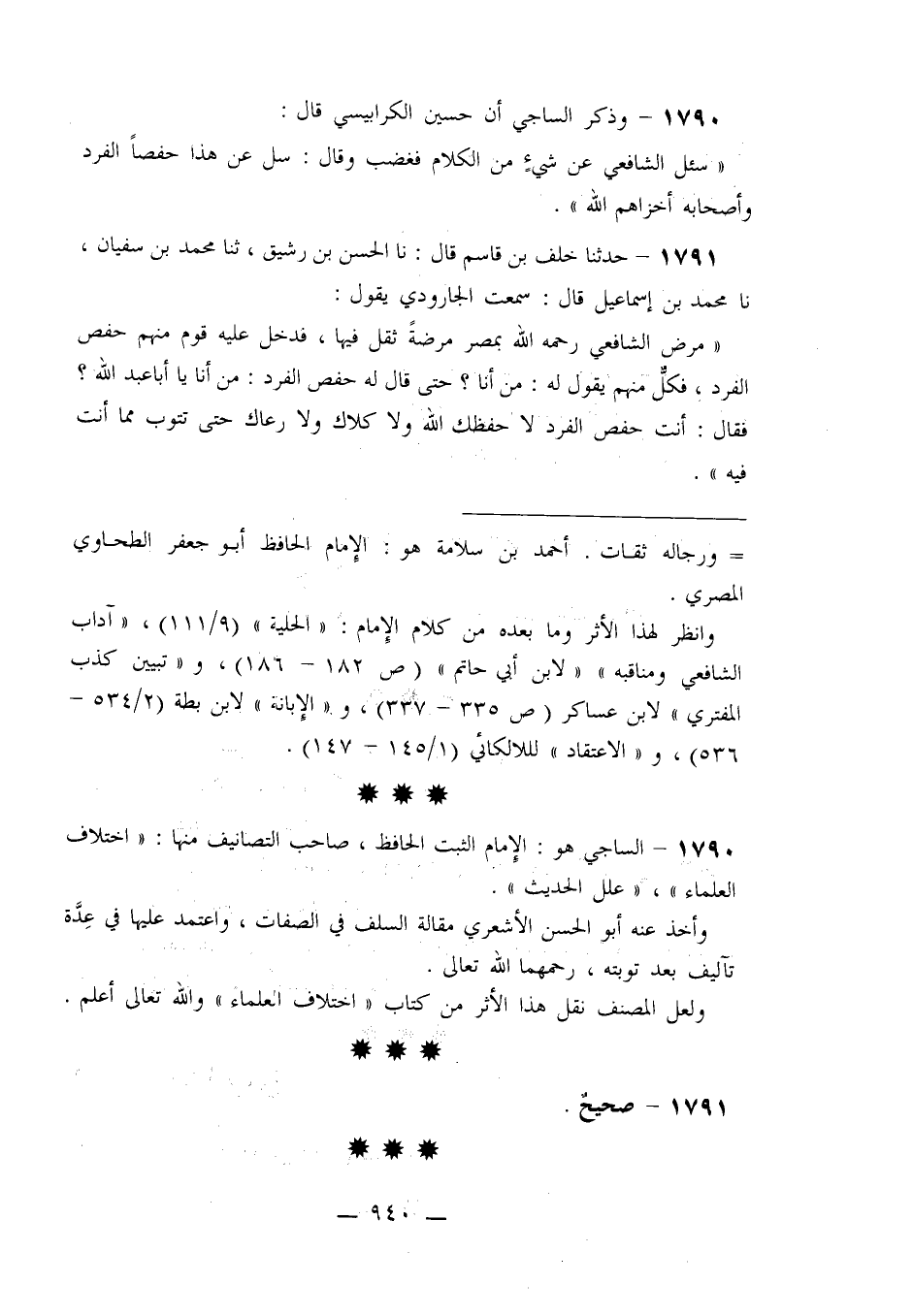 1791 - حَدَّثَنَا خَلَفُ بْنُ قَاسِمٍ قَالَ نا الْحَسَنُ بْنُ رَشِيقٍ ثنا مُحَمَّدُ بْنُ سُفْيَانَ نا مُحَمَّدُ بْنُ إِسْمَاعِيلَ قَالَ: سَمِعْتُ الْجَارُودِيُّ يَقُولُ: " §مَرِضَ الشَّافِعِيُّ رَحِمَهُ اللَّهُ بِمِصْرَ مَرْضَةً ثَقُلَ فِيهَا، فَدَخَلَ عَلَيْهِ قَوْمٌ مِنْهُمْ حَفْصٌ الْفَرْدُ، فَكُلٌّ مِنْهُمْ يَقُولُ لَهُ: مَنْ أَنَا، حَتَّى قَالَ لَهُ حَفْصٌ الْفَرْدُ: مَنْ أَنَا يَا أَبَا عَبْدَ اللَّهِ فَقَالَ: أَنْتَ حَفْصٌ الْفَرْدُ لَا حَفِظَكَ اللَّهُ وَلَا كَلَاكَ وَلَا رَعَاكَ حَتَّى تَتُوبَ مِمَّا أَنْتَ فِيهِ "