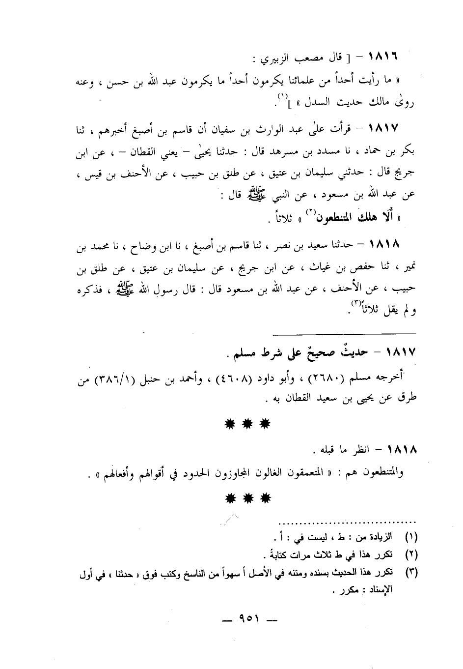 1818 - حَدَّثَنَا سَعِيدُ بْنُ نَصْرٍ، ثنا قَاسِمُ بْنُ أَصْبَغَ، نا ابْنُ وَضَّاحٍ، نا مُحَمَّدُ بْنُ نُمَيْرٍ، ثنا حَفْصُ بْنُ غِيَاثٍ، عَنِ ابْنِ جُرَيْجٍ، عَنْ سُلَيْمَانَ بْنِ عَتِيقٍ، عَنْ طَلْقِ بْنِ حَبِيبٍ، عَنِ الْأَحْنَفِ، عَنْ عَبْدِ اللَّهِ بْنِ مَسْعُودٍ قَالَ: قَالَ رَسُولُ اللَّهِ صَلَّى اللَّهُ عَلَيْهِ وَسَلَّمَ فَذَكَرَهُ وَلَمْ يَقُلْ ثَلَاثًا