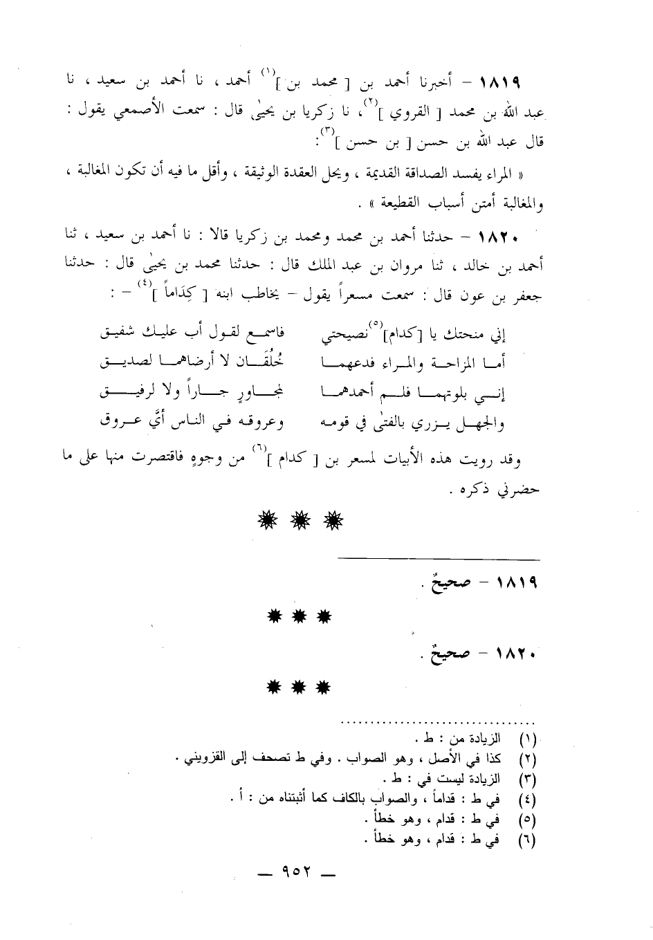 1820 - حَدَّثَنَا أَحْمَدُ بْنُ مُحَمَّدٍ، وَمُحَمَّدُ بْنُ زَكَرِيَّا، قَالَا: نا أَحْمَدُ بْنُ سَعِيدٍ، ثنا أَحْمَدُ بْنُ خَالِدٍ، ثنا مَرْوَانُ بْنُ عَبْدِ الْمَلِكِ، قَالَ: حَدَّثَنَا مُحَمَّدُ بْنُ يَحْيَى قَالَ: حَدَّثَنَا جَعْفَرُ بْنُ عَوْنٍ قَالَ: سَمِعْتُ مِسْعَرًا يَقُولُ يُخَاطِبُ ابْنَهُ كِدَامًا: