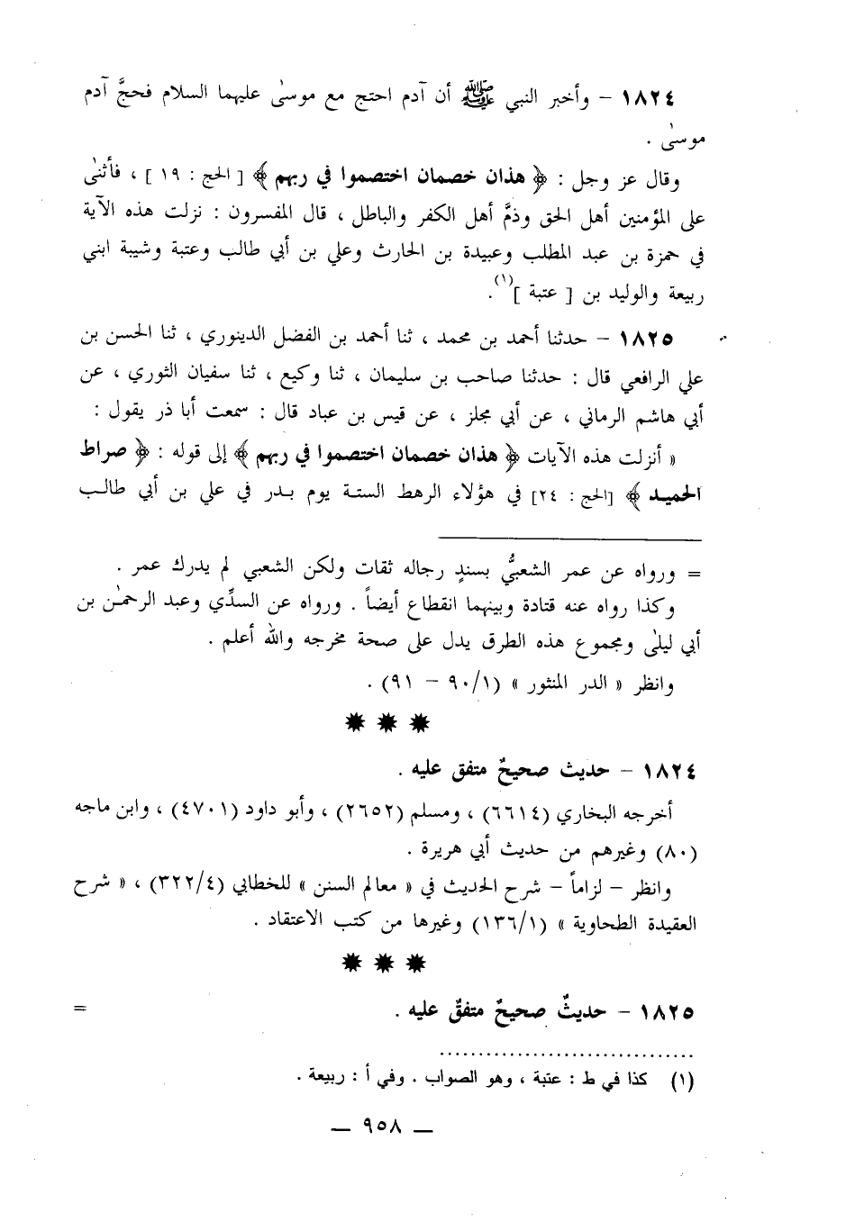 1825 - حَدَّثَنَا أَحْمَدُ بْنُ مُحَمَّدٍ، ثنا أَحْمَدُ بْنُ الْفَضْلِ الدَّيْنَوَرِيُّ، ثنا الْحَسَنُ بْنُ عَلِيٍّ الرَّافِعِيُّ، قَالَ حَدَّثَنَا صَاحِبُ بْنُ سُلَيْمَانَ، ثنا وَكِيعٌ، ثنا سُفْيَانُ الثَّوْرِيُّ، عَنْ أَبِي هَاشِمٍ الرُّمَّانِيِّ، عَنْ أَبِي مِجْلَزٍ، عَنْ قَيْسِ بْنِ عَبَّادٍ، قَالَ: سَمِعْتُ أَبَا ذَرٍّ، يَقُولُ: " أُنْزِلَتْ هَذِهِ الْآيَاتُ {§هَذَانِ خَصْمَانِ اخْتَصَمُوا} [الحج: 19] فِي رَبِّهِمْ إِلَى قَوْلِهِ {صِرَاطِ الْحَمِيدِ} [الحج: 24] فِي هَؤُلَاءِ الرَّهْطِ السِّتَّةِ يَوْمَ بَدْرٍ فِي عَلِيِّ بْنِ أَبِي طَالِبٍ، -[959]- وَحَمْزَةَ بْنِ عَبْدِ الْمُطَّلِبِ، وَعُبَيْدَةَ بْنِ الْحَارْثِ بْنِ عَبْدِ الْمُطَّلِبِ، وَعُتْبَةَ بْنِ رَبِيعَةَ، وَشَيْبَةَ بْنِ رَبِيعَةَ، وَالْوَلِيدِ بْنِ عُتْبَةَ "
