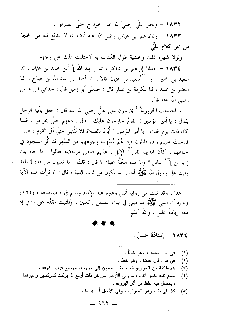 1834 - حَدَّثَنَا إِبْرَاهِيمُ بْنُ شَاكِرٍ، ثنا عَبْدُ اللَّهِ بْنُ مُحَمَّدِ بْنِ عُثْمَانَ، ثنا سَعِيدُ بْنُ حُمَيْرٍ وَسَعِيدُ بْنُ عُثْمَانَ، قَالَا: نا أَحْمَدُ بْنُ عَبْدِ اللَّهِ بْنِ صَالِحٍ، ثنا النَّضْرُ بْنُ مُحَمَّدٍ، ثنا عِكْرِمَةُ بْنُ عَمَّارٍ، قَالَ: حَدَّثَنِي أَبُو زُمَيْلٍ، قَالَ: حَدَّثَنِي ابْنُ عَبَّاسٍ رَضِيَ اللَّهُ عَنْهُ، قَالَ: §" لَمَّا اجْتَمَعَتِ الْحَرُورِيَّةُ يَخْرُجُونَ عَلَى عَلِيٍّ رَضِيَ اللَّهُ عَنْهُ قَالَ: جَعَلَ يَأْتِيهِ الرَّجُلُ يَقُولُ: يَا أَمِيرَ الْمُؤْمِنِينَ الْقَوْمُ خَارِجُونَ عَلَيْكَ، قَالَ: دَعْهُمْ حَتَّى يَخْرُجُوا، فَلَمَّا كَانَ ذَاتَ يَوْمٍ قُلْتُ: يَا أَمِيرَ الْمُؤْمِنِينَ، أَبْرِدْ بِالصَّلَاةِ فَلَا تَفُتْنِي حَتَّى آتِيَ الْقَوْمَ قَالَ: فَدَخَلْتُ عَلَيْهِمْ وَهُمْ قَائِلُونَ فَإِذَا هُمْ مُسْهَمَةٌ وُجُوهُهُمْ مِنَ السَّهَرِ، قَدْ أَثَّرَ السُّجُودُ فِي جِبَاهِهِمْ كَأَنَّ أَيْدِيَهُمْ ثَفِنُ الْإِبِلِ عَلَيْهِمْ قُمُصٌ مُرَحَّضَةٌ فَقَالُوا: مَا جَاءَ بِكَ يَا ابْنَ عَبَّاسٍ؟ وَمَا هَذِهِ الْحُلَّةُ عَلَيْكَ؟ قَالَ: قُلْتُ: مَا تَعِيبُونَ مِنِّي فَلَقَدْ رَأَيْتُ عَلَى رَسُولِ اللَّهِ صَلَّى اللَّهُ عَلَيْهِ وَسَلَّمَ أَحْسَنَ مَا يَكُونُ مِنْ ثِيَابِ الْيَمَنِيَّةِ، قَالَ: ثُمَّ قَرَأْتُ هَذِهِ الْآيَةَ -[963]- {قُلْ مَنْ حَرَّمَ زِينَةَ اللَّهِ الَّتِي أَخْرَجَ لَعِبَادِهِ وَالطَّيِّبَاتِ مِنَ الرِّزْقِ} [الأعراف: 32] فَقَالُوا: مَا جَاءَ بِكَ؟ قُلْتُ: جِئْتُكُمْ مِنْ عِنْدِ أَصْحَابِ رَسُولِ اللَّهِ صَلَّى اللَّهُ عَلَيْهِ وَسَلَّمَ وَلَيْسَ فِيكُمْ مِنْهُمْ أَحَدٌ، وَمِنْ عِنْدِ ابْنِ عَمِّ رَسُولِ اللَّهِ صَلَّى اللَّهُ عَلَيْهِ وَسَلَّمَ وَعَلَيْهِمْ نَزَلَ الْقُرْآنُ، وَهُمْ أَعْلَمُ بِتَأْوِيلِهِ جِئْتُ لِأُبَلِّغَكُمْ عَنْهُمْ وَأُبَلِّغَهُمْ عَنْكُمْ، فَقَالَ بَعْضُهُمْ: لَا تُخَاصِمُوا قُرَيْشًا فَإِنَّ اللَّهَ تَعَالَى يَقُولُ: {بَلْ هُمْ قَوْمٌ خَصِمُونَ} [الزخرف: 58] فَقَالَ بَعْضُهُمْ: بَلَى فَلَنُكَلِّمَنَّهُ قَالَ: فَكَلَّمَنِي مِنْهُمْ رَجُلَانِ أَوْ ثَلَاثَةٌ قَالَ: قُلْتُ: مَاذَا نَقَمْتُمْ عَلَيْهِ؟ قَالُوا: ثَلَاثًا فَقُلْتُ: مَا هُنَّ؟ قَالُوا: حَكَّمَ الرِّجَالَ فِي أَمْرِ اللَّهِ وَقَالَ اللَّهُ عَزَّ وَجَلَّ: {إِنِ الْحُكْمُ إِلَّا لِلَّهِ} [الأنعام: 57] قَالَ: قُلْتُ: هَذِهِ وَاحِدَةٌ وَمَاذَا أَيْضًا؟ قَالَ: فَإِنَّهُ قَاتَلَ فَلَمْ يَسْبِ وَلَمْ يَغْنَمْ، فَلَئِنْ كَانُوا مُؤْمِنِينَ مَا حَلَّ قِتَالُهُمْ وَلَئِنْ كَانُوا كَافِرِينَ لَقَدْ حَلَّ قِتَالُهُمْ وَسِبَاهُمْ، قَالَ: قُلْتُ: وَمَاذَا أَيْضًا؟ قَالُوا: وَمَحَا نَفْسَهُ مِنْ أَمِيرِ الْمُؤْمِنِينَ، فَإِنْ لَمْ يَكُنْ أَمِيرَ الْمُؤْمِنِينَ فَهُوَ أَمِيرُ الْكَافِرِينَ، قَالَ: قُلْتُ: أَرَأَيْتُمْ إِنْ أَتَيْتُكُمْ مِنْ كِتَابِ اللَّهِ وَسُنَّةِ رَسُولِ اللَّهِ صَلَّى اللَّهُ عَلَيْهِ وَسَلَّمَ مَا يَنْقُضُ قَوْلَكُمْ هَذَا، أَتَرْجِعُونَ؟ قَالُوا: وَمَا لَنَا لَا نَرْجِعُ؟ قُلْتُ: أَمَّا قَوْلُكُمْ: حَكَّمَ الرِّجَالَ فِي أَمْرِ اللَّهِ فَإِنَّ اللَّهَ عَزَّ وَجَلَّ قَالَ فِي كِتَابِهِ {يَا أَيُّهَا الَّذِينَ آمَنُوا لَا تَقْتُلُوا الصَّيْدَ وَأَنْتُمْ حُرُمٌ وَمَنْ قَتَلَهُ مِنْكُمْ مُتَعَمِّدًا فَجَزَاءٌ مِثْلُ مَا قَتَلَ مِنَ النَّعَمِ يَحْكُمُ بِهِ ذَوَا عَدْلٍ مِنْكُمْ} [المائدة: 95] وَقَالَ فِي الْمَرْأَةِ وَزَوْجِهَا {وَإِنْ خِفْتُمْ شِقَاقَ بَيْنِهِمَا فَابْعَثُوا حَكَمًا مِنْ أَهْلِهِ وَحَكَمًا مِنْ أَهْلِهَا} [النساء: 35] فَصَيَّرَ اللَّهُ تَعَالَى ذَلِكَ إِلَى حُكْمِ الرِّجَالِ فَنَشَدْتُكُمُ اللَّهَ أَتَعْلَمُون