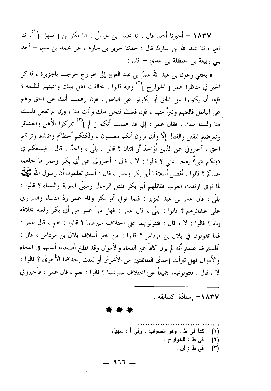 1837 - أَخْبَرَنَا أَحْمَدُ قَالَ: نا مُحَمَّدُ بْنُ عِيسَى، ثنا بَكْرُ بْنُ سَهْلٍ، ثنا نُعَيْمٌ، ثنا عَبْدُ اللَّهِ بْنُ الْمُبَارَكِ، قَالَ: حَدَّثَنَا جَرِيرُ بْنُ حَازِمٍ، عَنْ مُحَمَّدِ بْنِ سُلَيْمٍ أَحَدِ بَنِي رَبِيعَةَ بْنِ حَنْظَلَةَ بْنِ عَدِيٍّ قَالَ: بَعَثَنِي وَعَوْنَ بْنَ عَبْدِ اللَّهِ عُمَرُ بْنُ عَبْدِ الْعَزِيزِ، إِلَى خَوَارِجَ خَرَجَتْ بِالْجَزِيرَةِ فَذَكَرَ الْخَبَرَ فِي مُنَاظَرَةِ عُمَرَ الْخَوَارِجَ، وَفِيهِ قَالُوا: خَالَفْتَ أَهْلَ بَيْتِكَ وَسَمَّيْتَهُمُ الظَّلَمَةَ، فَإِمَّا أَنْ يَكُونُوا عَلَى الْحَقِّ أَوْ يَكُونُوا عَلَى الْبَاطِلِ، فَإِنْ زَعَمْتَ أَنَّكَ عَلَى الْحَقِّ وَهُمْ عَلَى الْبَاطِلِ فَالْعَنْهُمْ وَتَبْرَأْ مِنْهُمْ، فَإِنْ فَعَلْتَ فَنَحْنُ مِنْكَ وَأَنْتَ مِنَّا، وَإِنْ لَمْ تَفْعَلْ فَلَسْتَ مِنَّا وَلَسْنَا مِنْكَ، فَقَالَ عُمَرُ: " إِنِّي قَدْ §عَلِمْتُ أَنَّكُمْ لَمْ تَتْرُكُوا الْأَهْلَ وَالْعَشَائِرَ وَتَعَرَّضْتُمُ لِلْقَتْلَ وَالْقِتَالَ إِلَّا وَأَنْتُمْ تَرَوْنَ أَنَّكُمْ مُصِيبُونَ، وَلَكِنَّكُمْ أَخْطَأْتُمْ وَضَلَلْتُمْ وَتَرَكْتُمُ الْحَقَّ، أَخْبِرُونِي عَنِ الدِّينِ أَوَاحِدٌ أَوِ اثْنَانِ؟ قَالُوا: بَلْ وَاحِدٌ، قَالَ: فَيَسَعُكُمْ فِي دِينِكُمْ شَيْءٌ يَعْجِزُ عَنِّي؟ قَالُوا: لَا، قَالَ: أَخْبِرُونِي عَنْ أَبِي بَكْرٍ وَعُمَرَ مَا حَالُهُمَا عِنْدَكُمْ؟ قَالُوا: أَفْضَلُ أَسْلَافِنَا أَبُو بَكْرٍ وَعُمَرُ قَالَ: أَلَسْتُمْ تَعْلَمُونَ أَنَّ رَسُولَ اللَّهِ صَلَّى اللَّهُ عَلَيْهِ وَسَلَّمَ لَمَّا تُوُفِّيَ ارْتَدَّتِ الْعَرَبُ فَقَاتَلَهُمْ أَبُو بَكْرٍ فَقَتَلَ الرِّجَالَ وَسَبَى الذُّرِّيَّةَ وَالنِّسَاءَ؟ قَالُوا: بَلَى، قَالَ عُمَرُ بْنُ عَبْدِ الْعَزِيزِ: فَلَمَّا تُوُفِّيَ أَبُو بَكْرٍ وَقَامَ عُمَرُ رَدَّ النِّسَاءَ وَالذَّرَارِيَّ عَلَى عَشَائِرِهِمْ؟ قَالُوا: بَلَى، قَالَ عُمَرُ: فَهَلْ تَبَرَّأَ عُمَرُ مِنْ أَبِي بَكْرٍ وَلَعَنَهُ بِخِلَافِهِ إِيَّاهُ؟ قَالُوا: لَا، قَالَ: فَتَتَوَلَّوْنَهُمَا عَلَى اخْتِلَافِ سِيرَتِهِمَا؟ قَالُوا: نَعَمْ، قَالَ عُمَرُ: «فَمَا تَقُولُونَ فِي بِلَالِ بْنِ مِرْدَاسٍ؟» قَالُوا: مِنْ خَيْرِ أَسْلَافِنَا بِلَالُ بْنُ مِرْدَاسٍ قَالَ: " أَفْلَسْتُمْ قَدْ عَلِمْتُمْ أَنَّهُ لَمْ يَزَلْ كَافًّا عَنِ الدِّمَاءِ وَالْأَمْوَالِ وَقَدْ لَطَّخَ أَصْحَابُهُ أَيْدِيَهُمْ فِي الدِّمَاءِ والْأَمْوَالِ فَهَلْ تَبَرَّأَتْ إِحْدَى الطَّائِفَتَيْنِ مِنَ الْأُخْرَى أَوْ لَعَنَتْ إِحْدَاهُمَا الْأُخْرَى؟ قَالُوا: لَا قَالَ: فَتَتَوَلَّوْنَهُمَا جَمِيعًا عَلَى اخْتِلَافِ سِيرَتِهِمَا؟ " قَالُوا: نَعَمْ، قَالَ عُمَرُ: " فَأَخْبِرُونِي -[967]- عَنْ عَبْدِ اللَّهِ بْنِ وَهْبٍ الرَّاسِبِيِّ حِينَ خَرَجَ مِنَ الْبَصْرَةِ هُوَ وَأَصْحَابُهُ يُرِيدُونَ أَصْحَابَكُمْ بِالْكُوفَةِ فَمَرُّوا بِعَبْدِ اللَّهِ بْنِ خَبَّابٍ فَقَتَلُوهُ وَبَقَرُوا بَطْنَ جَارِيَتِهِ، ثُمَّ عَدَوْا عَلَى قَوْمٍ مِنْ بَنِي قَطِيعَةَ فَقَتَلُوا الرِّجَالَ وَأَخَذُوا الْأَمْوَالَ وَغَلُّوا الْأَطْفَالَ فِي الْمَرَاجِلِ وَتَأَوَّلُوا قَوْلَ اللَّهِ عَزَّ وَجَلَّ {إِنَّكَ إِنْ تَذَرْهُمْ يُضِلُّوا عِبَادَكَ وَلَا يَلِدُوا إِلَّا فَاجِرًا كَفَّارًا} [نوح: 27] ثُمَّ قَدِمُوا عَلَى أَصْحَابِهِمْ مِنْ أَهْلِ الْكُوفَةِ وَهُمْ كَافُّونَ عَنِ الْفُرُوجِ وَالدِّمَاءِ والْأَمْوَالِ فَهَلْ تَبَرَّأَتْ إِحْدَى الطَّائِفَتَيْنِ مِنَ الْأُخْرَى أَوْ لَعَنَتْ إِحْدَاهُمَا الْأُخْرَى؟ " قَالُوا: لَا، قَالَ عُمَرُ: «فَتَتَوَلَوْنَهُمَا عَلَى اخْتِلَافِ سِيرَتِهِمَا؟» قَالُوا: نَعَمْ قَالَ عُمَرُ: «فَهَؤُلَاءِ الَّ