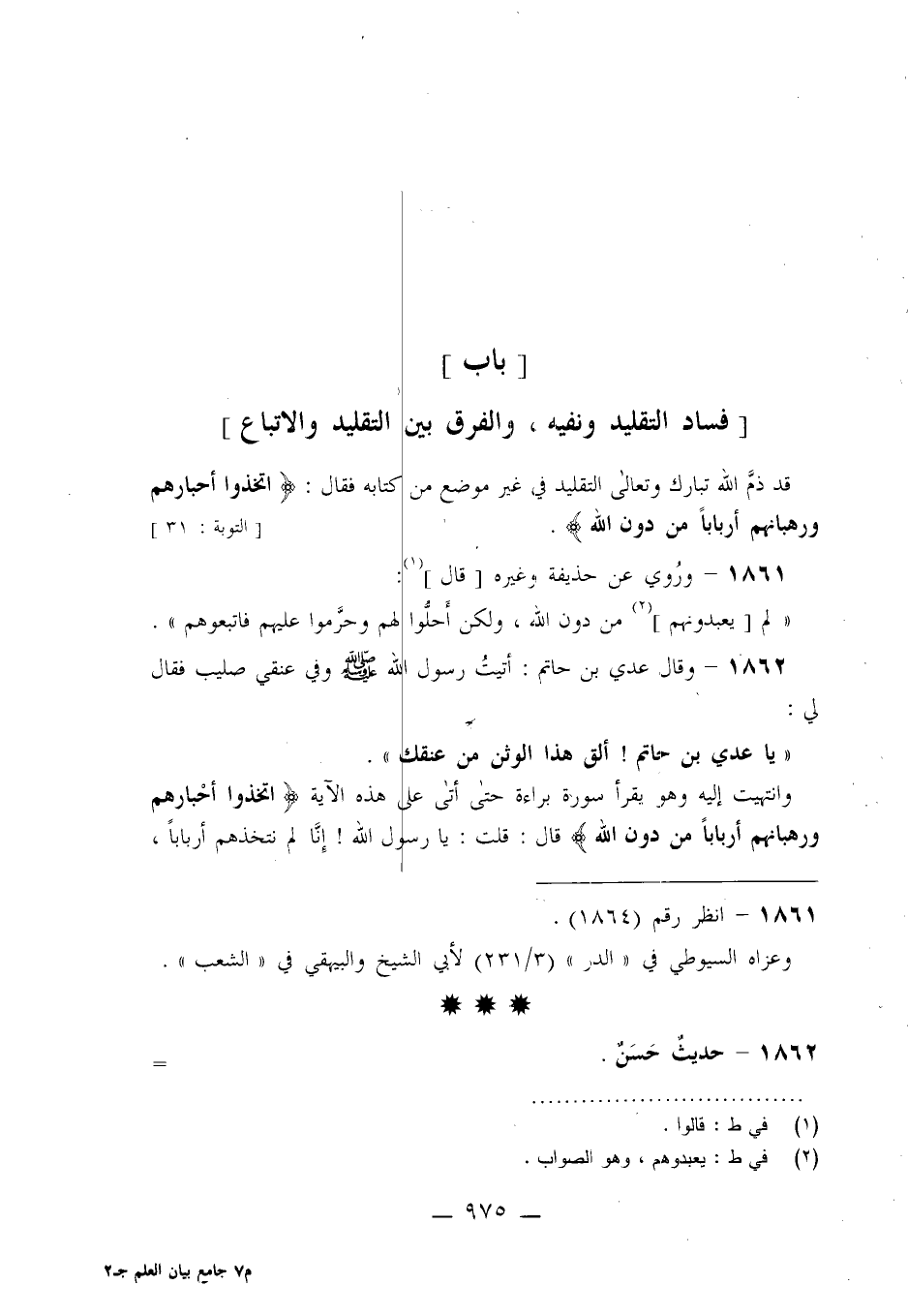 1861 - وَرُوِيَ عَنْ حُذَيْفَةَ وَغَيْرِهِ، قَالَ «لَمْ يَعْبُدُوهُمْ مِنْ دُونِ اللَّهِ وَلَكِنْ أَحَلُّوا لَهُمْ وَحَرَّمُوا عَلَيْهِمْ فَاتَّبَعُوهُمْ»