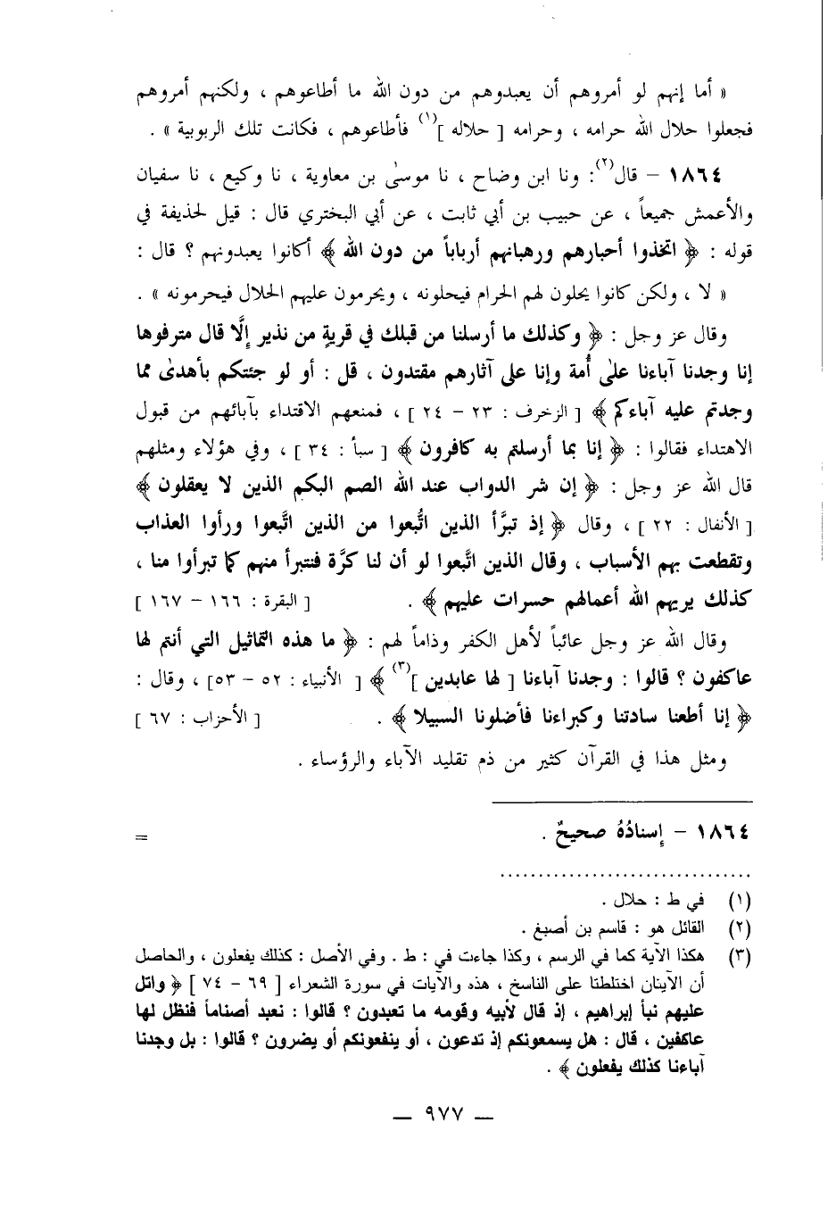 1864 - قَالَ: وَنا ابْنُ وَضَّاحٍ، نا مُوسَى بْنُ مُعَاوِيَةَ، نا وَكِيعٌ، نا سُفْيَانُ، وَالْأَعْمَشُ، جَمِيعًا عَنْ حَبِيبِ بْنِ أَبِي ثَابِتٍ، عَنْ أَبِي الْبَخْتَرِيِّ، قَالَ: قِيلَ لِحُذَيْفَةَ فِي قَوْلِهِ {§اتَّخَذُوا أَحْبَارَهُمْ وَرُهْبَانَهُمْ أَرْبَابًا مِنْ دُونِ اللَّهِ} [التوبة: 31] " أَكَانُوا يَعْبُدُونَهُمْ؟ قَالَ: لَا، وَلَكِنْ كَانُوا يُحِلُّونَ لَهُمُ الْحَرَامَ فَيُحِلُّونَهُ وَيُحَرِّمُونَ عَلَيْهِمُ الْحَلَالَ فَيُحَرِّمُونَهُ " وَقَالَ عَزَّ وَجَلَّ {وَكَذَلِكَ مَا أَرْسَلْنَا مِنْ قَبْلِكَ فِي قَرْيَةٍ مِنْ نَذِيرٍ إِلَّا قَالَ مُتْرَفُوهَا إِنَّا وَجَدْنَا آبَاءَنَا عَلَى أُمَّةٍ وَإِنَّا عَلَى آثَارِهِمْ مُقْتَدُونَ قَالَ أَوَلَوْ جِئْتُكُمْ بِأَهْدَى مِمَّا وَجَدْتُمْ عَلَيْهِ آبَاءَكُمْ} [الزخرف: 24] فَمَنَعَهُمُ الِاقْتِدَاءُ بِآبَائِهِمْ مِنْ قَبُولِ الِاهْتِدَاءِ فَقَالُوا: {إِنَّا بِمَا أُرْسِلْتُمْ بِهِ كَافِرُونَ} [سبأ: 34] وَفِي هَؤُلَاءِ وَمِثْلِهِمْ قَالَ اللَّهُ عَزَّ وَجَلَّ: {إِنَّ شَرَّ الدَّوَابِّ عِنْدَ اللَّهِ الصُّمُّ الْبُكْمُ الَّذِينَ لَا يَعْقِلُونَ} [الأنفال: 22] وَقَالَ: {إِذْ تَبَرَّأَ الَّذِينَ اتُّبِعُوا مِنَ الَّذِينَ اتَّبَعُوا وَرَأَوَا الْعَذَابَ وَتَقَطَّعَتْ بِهِمُ الْأَسْبَابُ وَقَالَ الَّذِينَ اتَّبَعُوا لَوْ أَنَّ لَنَا كَرَّةً فَنَتَبَرَّأَ مِنْهُمْ كَمَا تَبَرَّءُوا مِنَّا كَذَلِكَ يُرِيهُمُ اللَّهُ أَعْمَالَهُمْ حَسَرَاتٍ عَلَيْهِمْ} وَقَالَ اللَّهُ عَزَّ وَجَلَّ عَائِبًا لِأَهْلِ الْكُفْرِ وَذَامًّا لَهُمْ: {مَا هَذِهِ التَّمَاثِيلُ الَّتِي أَنْتُمْ لَهَا عَاكِفُونَ قَالُوا وَجَدْنَا آبَاءَنَا لَهَا عَابِدِينَ} [الأنبياء: 52] وَقَالَ {إِنَّا أَطَعْنَا سَادَتَنَا وَكُبَرَاءَنَا فَأَضَلُّونَا السَّبِيلَا} [الأحزاب: 67] وَمِثْلُ هَذَا فِي الْقُرْآنِ كَثِيرٌ مِنْ ذَمِّ تَقْلِيدِ الْآبَاءِ وَالرُّؤَسَاءِ، -[978]- قَالَ أَبُو عُمَرَ: وَقَدِ احْتَجَّ الْعُلَمَاءُ بِهَذِهِ الْآيَاتِ فِي إِبْطَالِ التَّقْلِيدِ وَلَمْ يَمْنَعْهُمْ كُفْرُ أَؤلْئِكَ مِنَ جِهَةِ الِاحْتِجَاجِ بِهَا؛ لِأَنَّ التَّشْبِيهَ لَمْ يَقَعْ مِنْ جِهَةِ كُفْرِ أَحَدِهِمَا وَإِيمَانِ الْآخَرِ وَإِنَّمَا وَقَعَ التَّشْبِيهُ بَيْنَ التَّقْلِيدَيْنِ بِغَيْرِ حُجَّةٍ لِلْمُقَلِّدِ كَمَا لَوْ قَلَّدَ رَجُلٌ فَكَفَرَ وَقَلَّدَ آخَرُ فَأَذْنَبَ وَقَلَّدَ آخَرَ فِي مَسْأَلَةِ دُنْيَاهُ فَأَخْطَأَ وَجْهَهَا، كَانَ كُلُّ وَاحِدٍ مَلُومًا عَلَى التَّقْلِيدِ بِغَيْرِ حُجَّةٍ؛ لِأَنَّ كُلَّ ذَلِكَ تَقْلِيدٌ يُشْبِهُ بَعْضُهُ بَعْضًا وَإِنِ اخْتَلَفَتِ الْآثَامُ فِيهِ، وَقَالَ اللَّهُ عَزَّ وَجَلَّ {وَمَا كَانَ اللَّهُ لِيُضِلَّ قَوْمًا بَعْدَ إِذْ هَدَاهُمْ حَتَّى يُبَيِّنَ لَهُمْ مَا يَتَّقُونَ} [التوبة: 115] وَقَدْ ثَبَتَ الِاحْتِجَاجُ بِمَا قَدَّمْنَا فِي الْبَابِ قَبْلَ هَذَا وَفِي ثُبُوتِهِ إِبْطَالُ التَّقْلِيدِ أَيْضًا، فَإِذَا بَطَلَ التَّقْلِيدُ بِكُلِّ مَا ذَكَرْنَا وَجَبَ التَّسْلِيمُ لِلْأُصُولِ الَّتِي يَجِبُ التَّسْلِيمُ لَهَا وَهِيَ الْكِتَابُ وَالسُّنَّةُ أَوْ مَا كَانَ فِي مَعْنَاهُمَا بِدَلِيلٍ جَامِعٍ بَيْنَ ذَلِكَ "