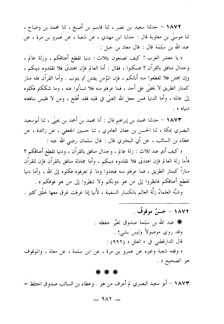 1872 - حَدَّثَنَا سَعِيدُ بْنُ نَصْرٍ، ثنا قَاسِمُ بْنُ أَصْبَغَ، ثنا مُحَمَّدُ بْنُ وَضَّاحٍ، ثنا مُوسَى بْنُ مُعَاوِيَةَ، قَالَ: حَدَّثَنَا ابْنُ مَهْدِيٍّ، عَنْ شُعْبَةَ، عَنْ عَمْرِو بْنِ مُرَّةَ، عَنْ عَبْدِ اللَّهِ بْنِ سَلَمَةَ، قَالَ: قَالَ مُعَاذُ بْنُ جَبَلٍ " يَا مَعْشَرَ الْعَرَبِ §كَيْفَ تَصْنَعُونَ بِثَلَاثٍ؟ دُنْيَا تَقْطَعُ أَعْنَاقَكُمْ، وَزَلَّةِ عَالِمٍ وَجِدَالِ مُنَافِقٍ بِالْقُرْآنِ، فَسَكَتُوا فَقَالَ: أَمَّا الْعَالِمُ فَإِنِ اهْتَدَى فَلَا تُقَلِّدُوهُ دِينَكُمْ، وَإِنِ افْتُتِنَ فَلَا تَقْطَعُوا مِنْهُ أَنَاتَكُمْ؛ فَإِنَّ الْمُؤْمِنَ يُفْتَتَنُ ثُمَّ يَتُوبُ، وَأَمَّا الْقُرْآنُ فَلَهُ مَنَارٌ كَمَنَارِ الطَّرِيقِ لَا يَخْفَى عَلَى أَحَدٍ، فَمَا عَرَفْتُمْ مِنْهُ فَلَا تَسْأَلُوا عَنْهُ، وَمَا شَكَكْتُمْ فَكِلُوهُ إِلَى عَالِمِهِ، وَأَمَّا الدُّنْيَا فَمَنْ جَعَلَ اللَّهُ الْغِنَى فِي قَلْبِهِ فَقَدْ أَفْلَحَ، وَمَنْ لَا فَلَيْسَ بِنَافِعَتِهِ دُنْيَاهُ "