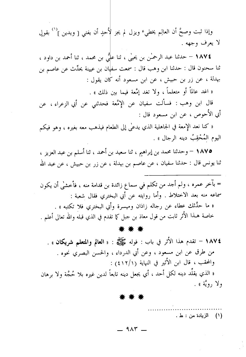 1875 - وَحَدَّثَنَا مُحَمَّدُ بْنُ إِبْرَاهِيمَ، ثنا سَعِيدُ بْنُ أَحْمَدَ، ثنا أَسْلَمُ بْنُ عَبْدِ الْعَزِيزِ، ثنا يُونُسُ، قَالَ: حَدَّثَنَا سُفْيَانُ، عَنْ عَاصِمِ ابْنِ بَهْدَلَةَ، عَنْ زِرِّ بْنِ حُبَيْشٍ، عَنْ عَبْدِ اللَّهِ -[984]- بْنِ مَسْعُودٍ، أَنَّهُ كَانَ يَقُولُ: §«اغْدُ عَالِمًا أَوْ مُتَعَلِّمًا وَلَا تَغْدُوَنَّ إِمَّعَةً فِيمَا بَيْنَ ذَلِكَ»