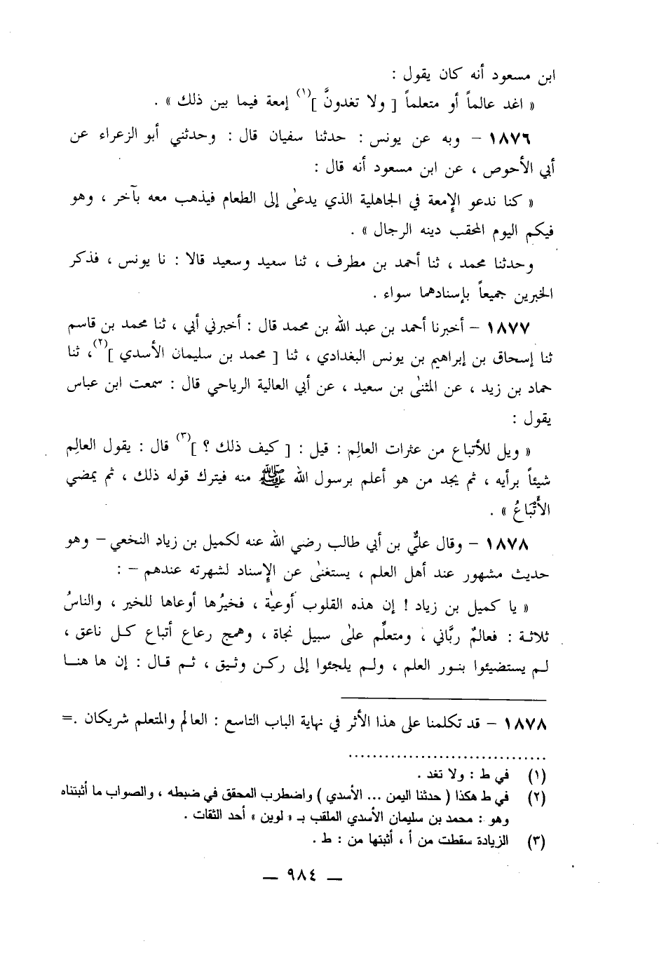 1876 - وَبِهِ عَنْ يُونُسَ، حَدَّثَنَا سُفْيَانُ، قَالَ: وَحَدَّثَنِي أَبُو الزَّعْرَاءِ، عَنْ أَبِي الْأَحْوَصِ، عَنِ ابْنِ مَسْعُودٍ، أَنَّهُ قَالَ: «كُنَّا §نَدْعُو الْإِمَّعَةَ فِي الْجَاهِلِيَّةِ الَّذِي يُدْعَى إِلَى الطَّعَامِ فَيُذْهَبُ مَعَهُ بِآخَرَ وَهُوَ فِيكُمُ الْيَوْمَ الْمُحْقِبُ دِينَهُ الرِّجَالَ» وَحَدَّثَنَا مُحَمَّدٌ، ثنا أَحْمَدُ بْنُ مُطَرِّفٍ، ثنا سَعِيدٌ، وَسَعِيدٌ قَالَا: نا يُونُسُ، فَذَكَرَ الْخَبَرَيْنِ جَمِيعًا بِإِسْنَادِهِمَا سَوَاءً