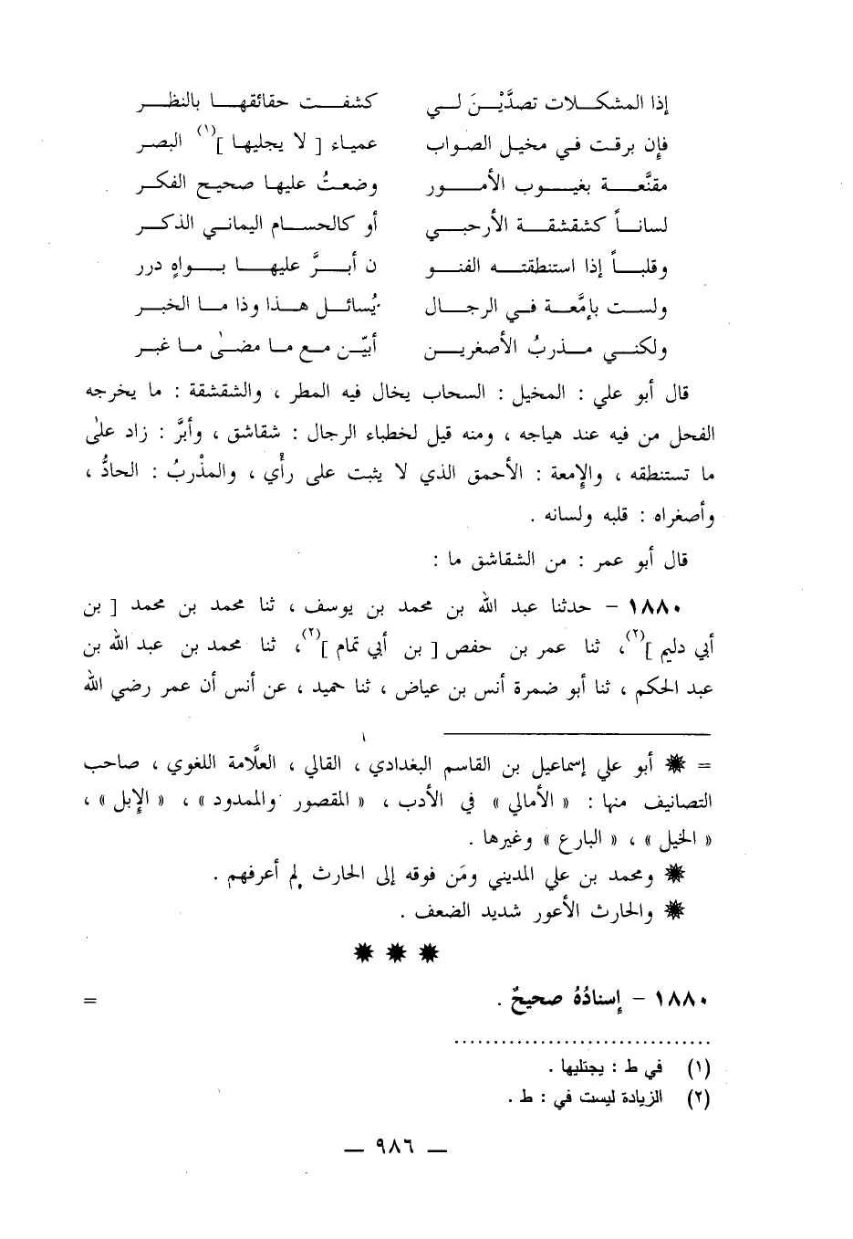 1880 - قَالَ أَبُو عُمَرَ: مِنَ الشَّقَاشِقِ مَا: حَدَّثَنَا عَبْدُ اللَّهِ بْنُ مُحَمَّدِ بْنِ يُوسُفَ ثنا مُحَمَّدُ بْنُ مُحَمَّدِ بْنِ أَبِي دُلَيْمٍ ثنا عُمَرُ بْنُ حَفْصِ بْنِ أَبِي تَمَّامٍ ثنا مُحَمَّدُ بْنُ عَبْدِ اللَّهِ بْنِ عَبْدِ الْحَكَمِ، ثنا أَبُو ضَمْرَةَ أَنَسُ بْنُ عِيَاضٍ، ثنا حُمَيْدٌ، عَنْ أَنَسٍ، أَنَّ عُمَرَ رَضِيَ اللَّهُ -[987]- عَنْهُ، رَأَى رَجُلًا يَخْطُبُ فَأَكْثَرَ فَقَالَ عُمَرُ «إِنَّ §كَثِيرًا مِنَ الْخُطَبِ مِنْ شَقَاشِقِ الشَّيْطَانِ»