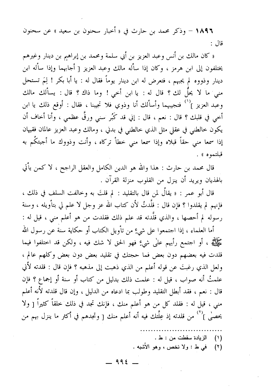 1896 - وَذَكَرَ مُحَمَّدُ بْنُ حَارِثٍ فِي أَخْبَارِ سُحْنُونَ بْنِ سَعِيدٍ، عَنْ سُحْنُونَ، قَالَ: كَانَ مَالِكُ بْنُ أَنَسٍ، وَعَبْدُ الْعَزِيزِ بْنُ أَبِي سَلَمَةَ، وَمُحَمَّدُ بْنُ إِبْرَاهِيمَ بْنِ دِينَارٍ وَغَيْرُهُمْ يَخْتَلِفُونَ إِلَى ابْنِ هُرْمُزَ، وَكَانَ إِذَا سَأَلَهُ مَالِكٌ وَعَبْدُ الْعَزِيزِ أَجَابَهُمَا وَإِذَا سَأَلَهُ ابْنُ دِينَارٍ وَذَوُوهُ لَمْ يُجِبْهُمْ، فَتَعَرَّضَ لَهُ ابْنُ دِينَارٍ يَوْمًا فَقَالَ لَهُ: يَا أَبَا بَكْرٍ لِمَ تَسْتَحِلُّ مِنِّي مَا لَا يَحِلُّ لَكَ؟ قَالَ لَهُ: يَا ابْنَ أَخِي وَمَا ذَاكَ؟ قَالَ: يَسْأَلُكَ مَالِكٌ وَعَبْدُ الْعَزِيزِ فَتُجِيبُهُمَا وَأَسْأَلُكَ أَنَا وَذَوِي فَلَا تُجِيبُنَا؟ فَقَالَ: «أَوَقَعَ ذَلِكَ يَا ابْنَ أَخِي فِي قَلْبِكَ؟» قَالَ: نَعَمْ، قَالَ: إِنِّي §قَدْ كَبُرَ سِنِّي وَرَقَّ عَظْمِي، وَأَنَا أَخَافُ أَنْ يَكُونَ خَالَطَنِي فِي عَقْلِي مِثْلُ الَّذِي خَالَطَنِي فِي بَدَنِي " وَمَالِكٌ وَعَبْدُ الْعَزِيزِ عَالِمَانِ فَقِيهَانِ إِذَا سَمِعَا مِنِّي حَقًّا قَبِلَاهُ وَإِذَا سَمِعَا مِنِّي خَطَأً تَرَكَاهُ وَأَنْتَ وَذَوُوكَ مَا أَجَبْتُكُمْ بِهِ قَبِلْتُمُوهُ، قَالَ مُحَمَّدُ بْنُ حَارِثٍ: هَذَا وَاللَّهِ هُوَ الدِّينُ الْكَامِلُ وَالْعَقْلُ الرَّاجِحُ لَا كَمَنْ يَأْتِي بِالْهَذَيَانِ وَيُرِيدُ أَنْ يَنْزِلَ مِنَ الْقُلُوبِ مَنْزِلَةَ الْقُرْآنِ " قَالَ أَبُو عُمَرَ: " يُقَالُ لِمَنْ قَالَ بِالتَّقْلِيدِ: لِمَ قُلْتُ بِهِ وَخَالَفْتَ السَّلَفَ فِي ذَلِكَ؟ فَإِنَّهُمْ لَمْ يُقَلِّدُوا فَإِنْ قَالَ: قَلَّدْتُ؛ لِأَنَّ كِتَابَ اللَّهِ عَزَّ وَجَلَّ لَا عِلْمَ لِي بِتَأْوِيلِهِ، وَسُنَّةَ رَسُولِهِ لَمْ أُحْصِهَا وَالَّذِي قَلَّدْتُهُ قَدْ عَلِمَ ذَلِكَ فَقَلَّدْتُ مَنْ هُوَ أَعْلَمُ مِنِّي قِيلَ لَهُ: أَمَّا الْعُلَمَاءُ إِذَا اجْتَمَعُوا عَلَى شَيْءٍ مِنْ تَأْوِيلِ الْكِتَابِ أَوْ حِكَايَةِ سُنَّةٍ عَنْ رَسُولِ اللَّهِ صَلَّى اللَّهُ عَلَيْهِ وَسَلَّمَ أَوِ اجْتَمَعَ رَأْيُهُمْ عَلَى شَيْءٍ فَهُوَ الْحَقُّ لَا شَكَّ فِيهِ، وَلَكِنْ قَدِ اخْتَلَفُوا فِيمَا قَلَّدَتْ فِيهِ بَعْضُهُمْ دُونَ بَعْضٍ، فَمَا حُجَّتُكَ فِي تَقْلِيدِ بَعْضٍ دُونَ بَعْضٍ، وَكُلُّهُمْ عَالِمٌ وَلَعَلَّ الَّذِي رَغِبْتَ عَنْ قَوْلِهِ أَعْلَمُ مِنَ الَّذِي ذَهَبْتُ إِلَى مَذْهَبِهِ، فَإِنْ قَالَ: قَلَّدْتُهُ لِأَنِّي عَلِمْتُ أَنَّهُ صَوَابٌ قِيلَ لَهُ: عَلِمْتَ ذَلِكَ بِدَلِيلٍ مِنْ كِتَابٍ أَوْ سُنَّةٍ أَوْ إِجْمَاعٍ، فَإِنْ قَالَ: نَعَمْ، فَقَدْ أَبْطَلَ التَّقْلِيدَ وَطُولِبَ بِمَا ادَّعَاهُ مِنَ الدَّلِيلِ وَإِنْ قَالَ: قَلَّدْتُهُ لِأَنَّهُ أَعْلَمُ مِنِّي، قِيلَ لَهُ: فَقَلِّدْ كُلَّ مَنْ هُوَ أَعْلَمُ مِنْكَ فَإِنَّكَ تَجِدُ مِنْ ذَلِكَ خَلْقًا كَثِيرًا وَلَا يُحصَى مَنْ قَلَّدْتَهُ إِذْ عِلَّتُكَ فِيهِ أَنَّهُ أَعْلَمُ مِنْكَ وَتَجِدُهُمْ فِي أَكْثَرِ مَا يَنْزِلُ بِهِمْ مِنَ -[995]- السُّؤَالِ مُخْتَلِفِينَ فَلِمَ قَلَّدْتَ أَحَدَهُمْ؟ فَإِنْ قَالَ: قَلَّدْتُهُ لِأَنَّهُ أَعْلَمُ النَّاسِ قِيلَ لَهُ: فَهُوَ إِذًا أَعْلَمُ مِنَ الصَّحَابَةِ وَكَفَى بِقَوْلٍ مِثْلِ هَذَا قُبْحًا وَإِنْ قَالَ: إِنَّمَا قَلَّدْتُ بَعْضَ الصَّحَابَةِ قِيلَ لَهُ: فَمَا حُجَّتُكَ فِي تَرْكِ مَنْ لَمْ تُقَلِّدْ مِنْهُمْ؟ وَلَعَلَّ مَنْ تَرَكْتَ قَوْلَهُ مِنْهُمْ أَعْلَمُ وَأَفْضَلُ مِمَّنْ أَخَذْتَ بِقَوْلِهِ عَلَى أَنَّ الْقَوْلَ لَا يَصِحُّ لِفَضْلِ قَائِلِهِ وَإِنَّمَا يَصِحُّ بِدَلَالَةِ الدَّلِيلِ عَلَيْهِ "