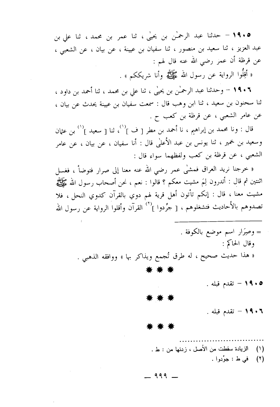 1905 - حَدَّثَنَا عَبْدُ الرَّحْمَنِ بْنُ يَحْيَى، ثنا عُمَرُ بْنُ مُحَمَّدٍ، ثنا عَلِيُّ بْنُ عَبْدِ الْعَزِيزِ، ثنا سَعِيدُ بْنُ مَنْصُورٍ، ثنا سُفْيَانُ بْنُ عُيَيْنَةَ، عَنْ بَيَانٍ، عَنِ الشَّعْبِيِّ، عَنْ قَرَظَةَ، أَنَّ عُمَرَ، رَضِيَ اللَّهُ عَنْهُ قَالَ لَهُمْ: §«أَقِلُّوا الرِّوَايَةَ عَنْ رَسُولِ اللَّهِ صَلَّى اللَّهُ عَلَيْهِ وَسَلَّمَ وَأَنَا شَرِيكُكُمْ»