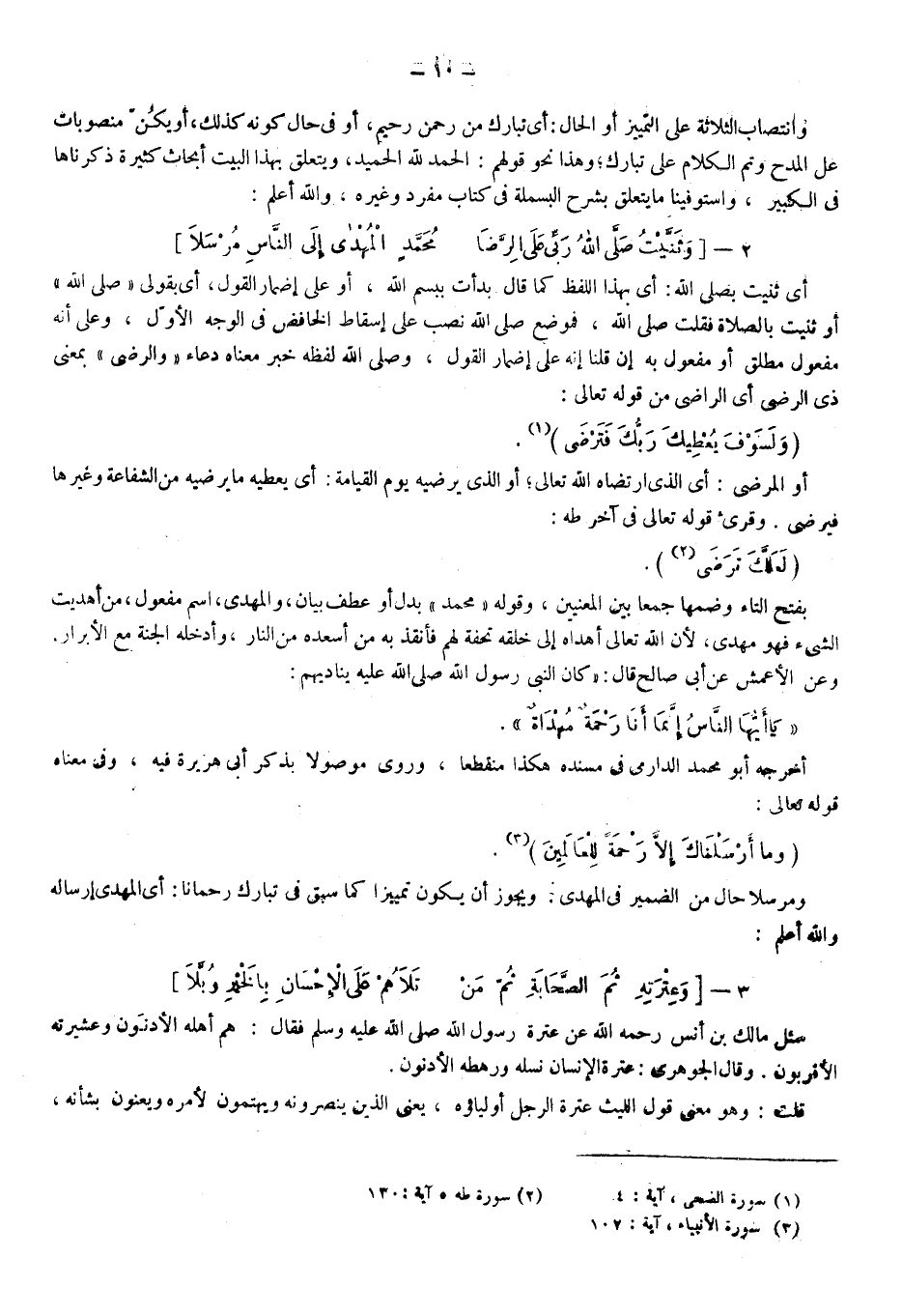 وانتصاب الثلاثة على التمييز أو الحال: أي تبارك من رحمن رحيم أو في حال كونه كذلك أو يكنَّ منصوبات على المدح وتم الكلام على تبارك، وهذا نحو قولهم: الحمد لله الحميد ويتعلق بهذا البيت أبحاث كثيرة ذكرناها في الكبير واستوفينا ما يتعلق بشرح البسملة في كتاب مفرد وغيره والله أعلم: