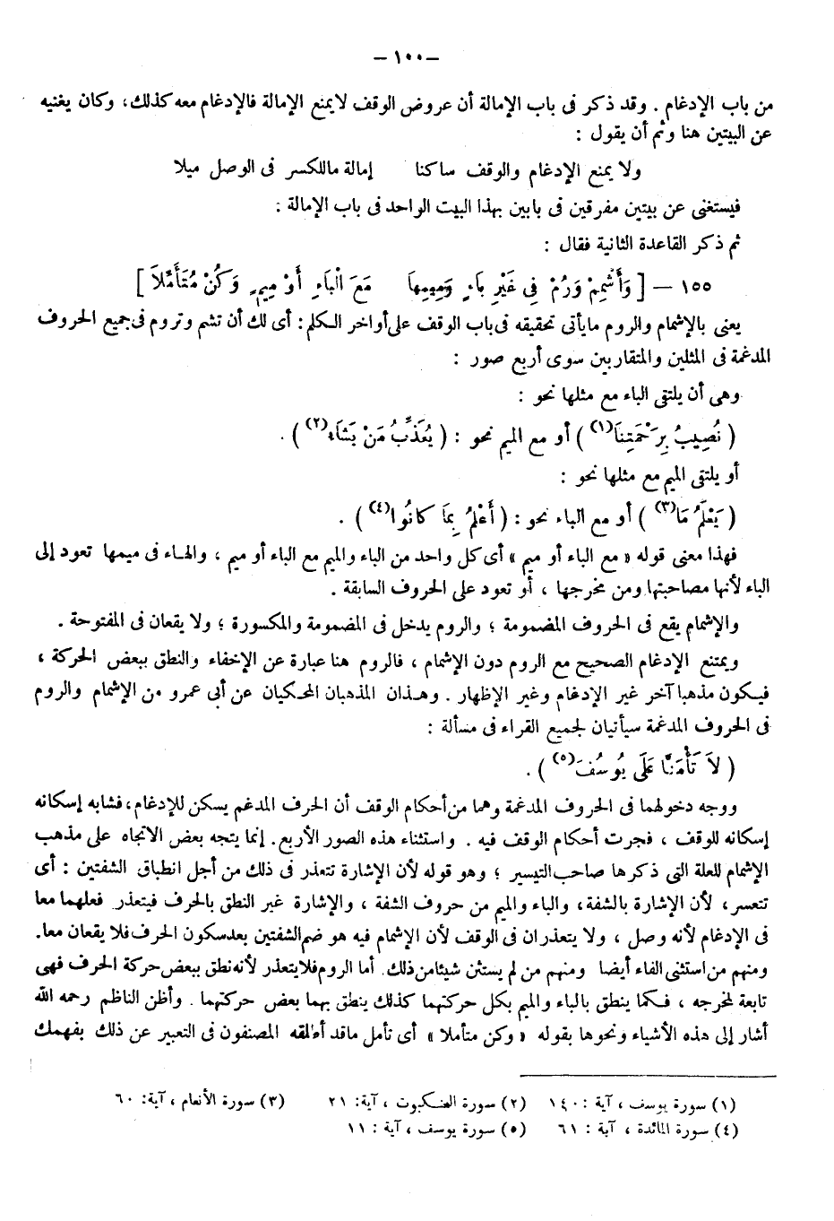 يعني بالإشمام والروم ما يأتي تحقيقه في باب الوقف على أواخر الكلم أي لك أن تشم وتروم في جميع الحروف المدغمة في المثلين والمتقاربين سوى أربع صور: