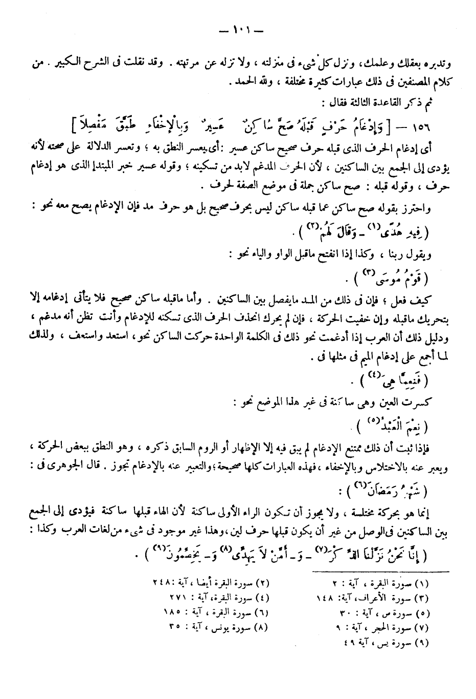 واحترز بقوله: صح ساكن عما قبله ساكن ليس بحرف صحيح بل هو حرف مد؛ فإن الإدغام يصح معه نحو: {فِيهِ هُدىً} 1، {وَقَالَ لَهُمْ} 2، و {يَقُولُ رَبَّنَا} ، وكذا إذا انفتح ما قبل الواو والياء نحو: {قَوْمُ مُوسَى} 3.