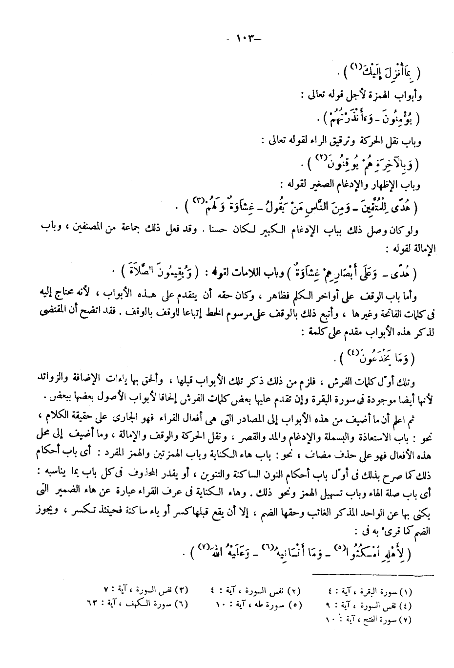 ثم اعلم أن ما أضيف من هذه الأبواب إلى المصادر التي هي أفعال القراء فهو الجاري على حقيقة الكلام، نحو: باب الاستعاذة والبسملة والإدغام والمد والقصر، ونقل الحركة والوقف والإمالة، وما أضيف إلى محل هذه الأفعال فهو على حذف مضاف، نحو: باب هاء الكناية وباب الهمزتين والهمز المفرد: أي باب أحكام ذلك كما صرح بذلك في أول باب أحكام النون الساكنة والتنوين، أو يقدر المحذوف في كل باب بما يناسبه: أي باب صلة الهاء، وباب تسهيل الهمز، ونحو ذلك. وهاء الكناية في عرف القراء عبارة عن هاء الضمير التي يكنى بها عن الواحد المذكر الغائب وحقها الضم، إلا أن يقع قبلها كسر أو ياء ساكنة فحينئذ تكسر، ويجوز الضم كما قرئ به في: {لِأَهْلِهِ امْكُثُوا} 5، {وَمَا أَنْسَانِيهُ} 6، {عَلَيْهُ اللَّهَ} 7.