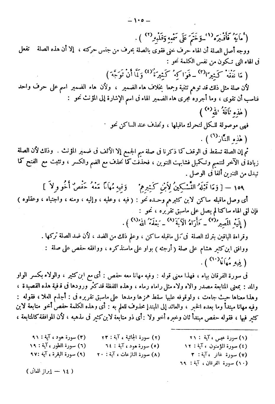 ثم إن الصلة تسقط في الوقف كما ذكرنا في صلة ميم الجمع إلا الألف في ضمير المؤنث، وذلك لأن الصلة زيادة في الآخر لتتميم وتكميل فشابهت التنوين فحذفت كما تحذف مع الضم والكسر وتثبت مع الفتح كما تبدل من التنوين ألفا في الوصل.