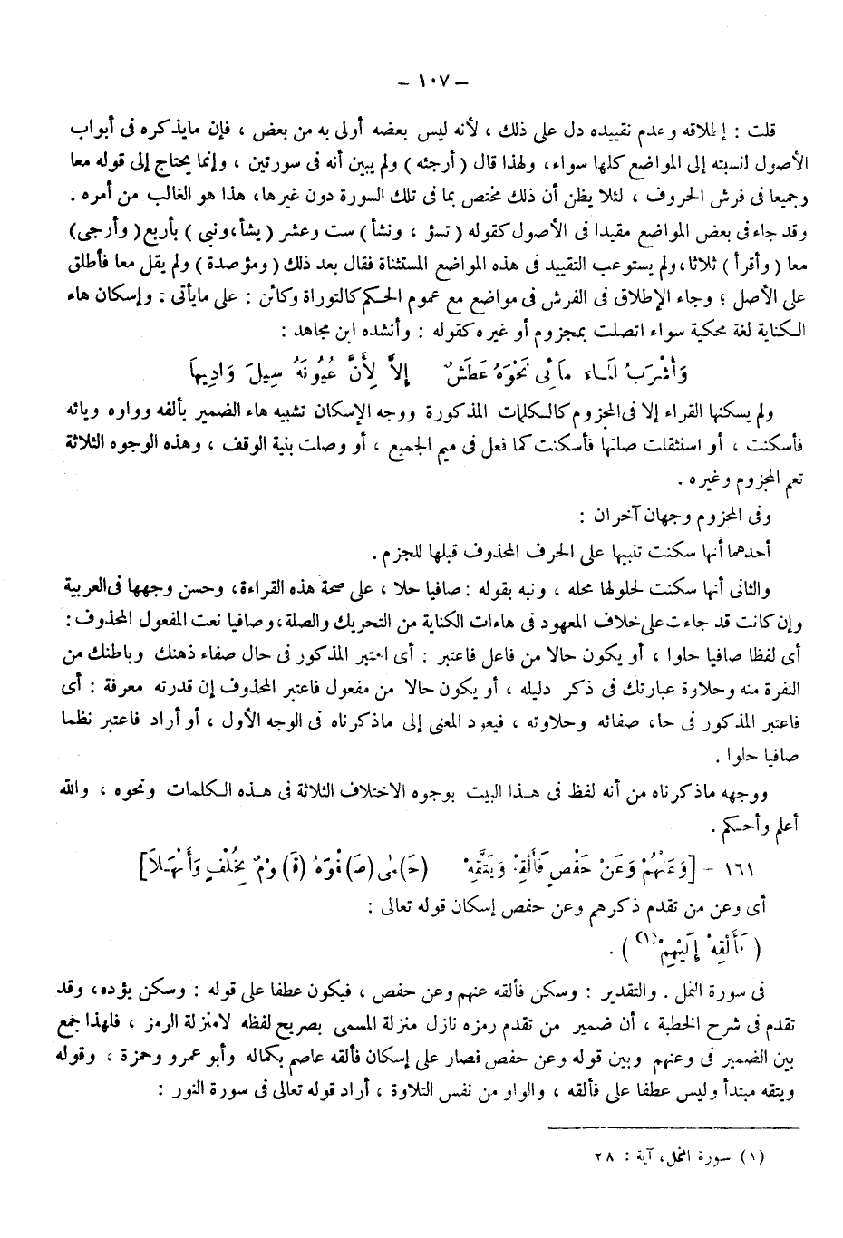 والثاني أنها سكنت لحلولها محله، ونبه بقوله صافيا حلا على صحة هذه القراءة وحسن وجهها في العربية وإن كانت قد جاءت على خلاف المعهود في هاءات الكناية من التحريك والصلة وصافيا نعت المفعول المحذوف أي لفظا صافيا حلوا أو يكون حالا من فاعل فاعتبر: أي اعتبر المذكور في حال صفاء ذهنك وباطنك من النفرة منه وحلاوة عبارتك في ذكر دليله أو يكون حالا من مفعول فاعتبر المحذوف إن قدرته معرفة أي فاعتبر المذكور في حا صفائه وحلاوته فيعود المعنى إلى ما ذكرناه في الوجه الأول أو أراد فاعتبر نظما صافيا حلوا.