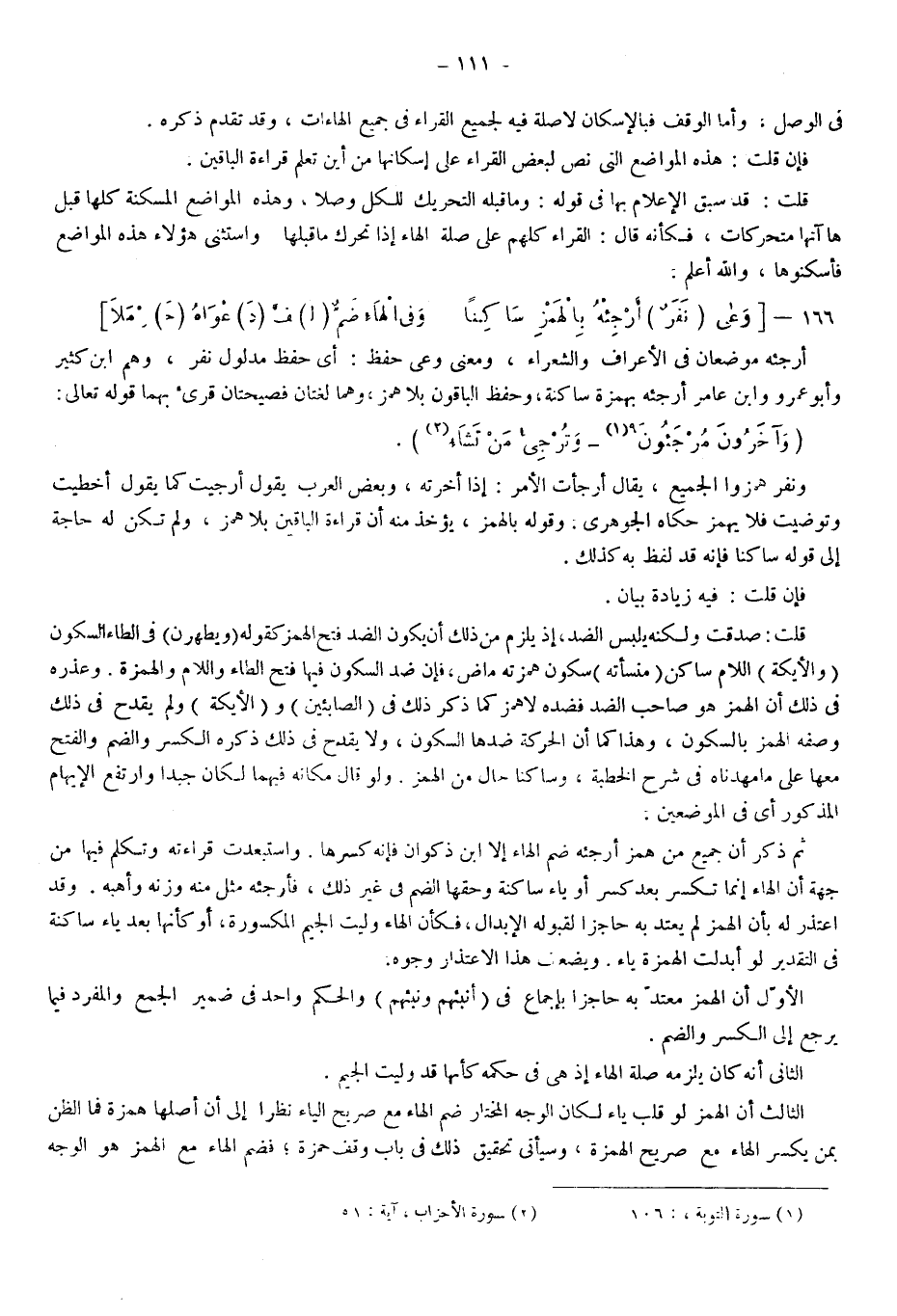 ثم ذكر أن جميع من همز أرجئه ضم الهاء إلا ابن ذكوان فإنه كسرها، واستبعدت قراءته وتكلم فيها من جهة أن الهاء إنما تكسر بعد كسر أو ياء ساكنة وحقها الضم في غير ذلك فأرجئه مثل منه وزنه وأهبه، وقد اعتذر له بأن الهمز لم يعتد به حاجزًا؛ لقبوله الإبدال فكأن الهاء وَلِيَتِ الجيم المكسورة أو كأنها بعد ياء ساكنة في التقدير لو أبدلت الهمزة ياء، ويضعف هذا الاعتذار وجوه.