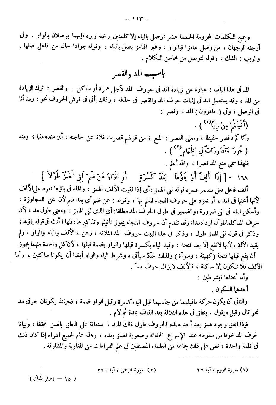 المد في الباب: عبارة عن زيادة المد في حروف المد لأجل همزة أو ساكن. والقصر: ترك الزيادة من المد، وقد يستعمل المد في إثبات حرف المد والقصر في حذفه، وذلك يأتي في فرش الحروف نحو: ومد أنا في الوصل، وفي "حاذرون" المد، وقصر: {آتَيْتُمْ مِنْ رِبًا} 1.