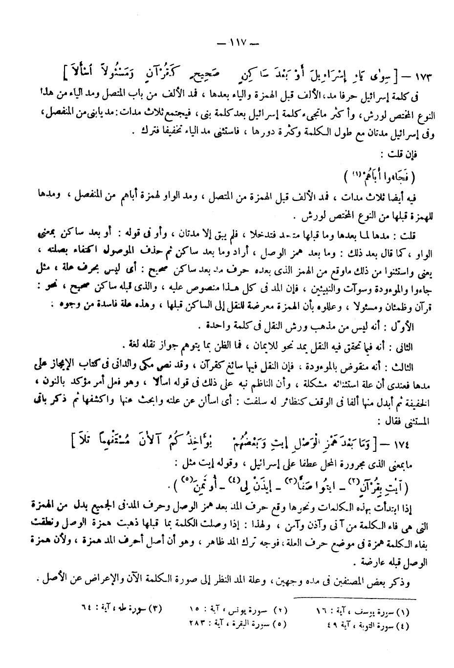 الثالث: أنه منقوض بالموءودة فإن النقل فيها سائغ كقرآن، وقد نص مكي، والداني في كتاب الإيجاز على مدها فعندي أن علة استثنائه مشكلة، وأن الناظم نبه على ذلك في قوله: اسألا، وهو فعل أمر مؤكد بالنون الخفيفة، ثم أبدل منها ألفا في الوقف كنظائر له سلفت أي اسألن عن علته وابحث عنها واكشفها ثم ذكر باقي المستثنى فقال: