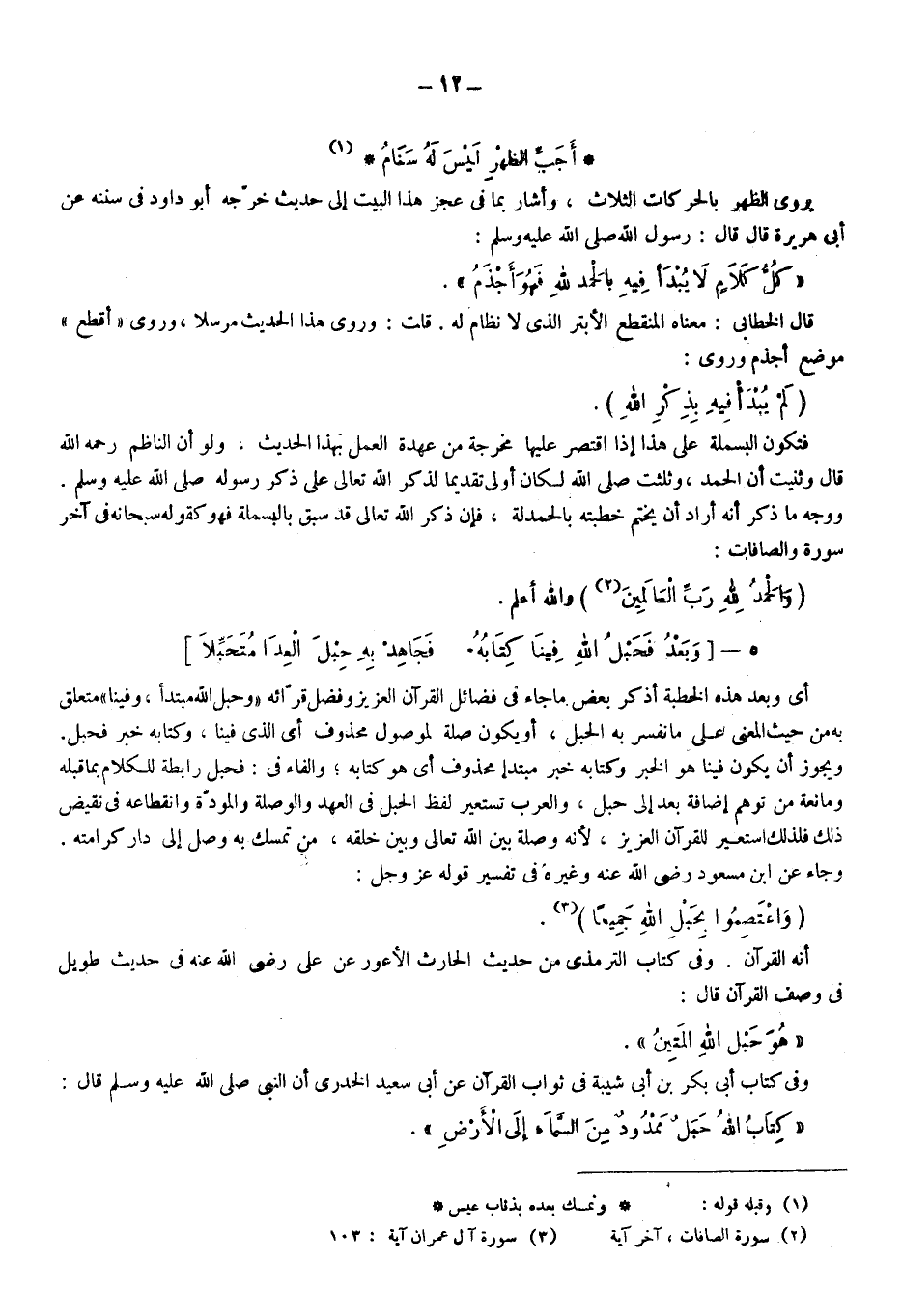 يروى الظهر بالحركات الثلاث وأشار بما في عجز هذا البيت إلى حديث خرجه أبو داود في سننه عن أبي هريرة قال: قال رسول الله صلى الله عليه وسلم: "كل كلام لا يبدأ فيه بالحمد لله فهو أجذم".