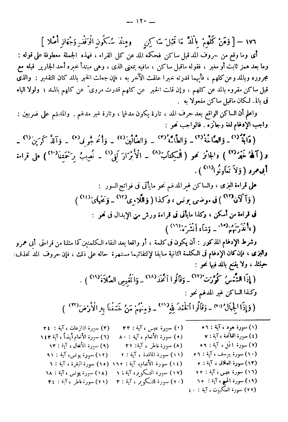 واعلم أن الساكن الواقع بعد حرف المد تارة يكون مدغما وتارة غير مدغم والمدغم على ضربين واجب الإدغام لغة وجائزه فالواجب نحو: {دَابَّة} 1، {الصَّاخَّة} 2، {الطَّامَّة} 3، {الضَّالِّين} 4، {أَتُحَاجُّونِّي} 5، {آلذَّكَرَيْنِ} 6، {اللَّهُ خَيْرُ} 7، والجائز نحو: {الْكِتَابَ} 8، {الْأَبْرَارَ لَفِي} 9، {نُصِيبُ بِرَحْمَتِنَا} 10، على قراءة أبي عمرو {وَلا تَعَاوَنُوا} 11، على قراءة البزي والساكن غير المدغم نحو ما يأتي في فواتح السور: {آلْآنَ} 12 في موضعي يونس، وكذا {وَاللَّائِي} 13، {وَمَحْيَايَ} 14. في قراءة من أسكن وكذا ما يأتي في قراءة ورش من الإبدال في نحو: {أَأَنْذَرْتَهُمْ} 15، {شَاءَ أَنْشَرَهُ} 16.