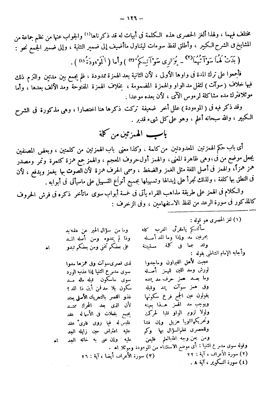 مختلف فيهما ولهذا ألغز الحصري هذه الكلمة في أبيات له قد ذكرناها1، والجواب عنها من نظم جماعة من المشايخ في الشرح الكبير وأطلق لفظ سوءات؛ ليتناول ما أضيف إلى ضمير التثنية وإلى ضمير الجمع نحو: {بَدَتْ لَهُمَا سَوْآتُهُمَا} 2، {يُوَارِي سَوْآتِكُمْ} 3 وأما {الْمَوْؤُودَةُ} 4.