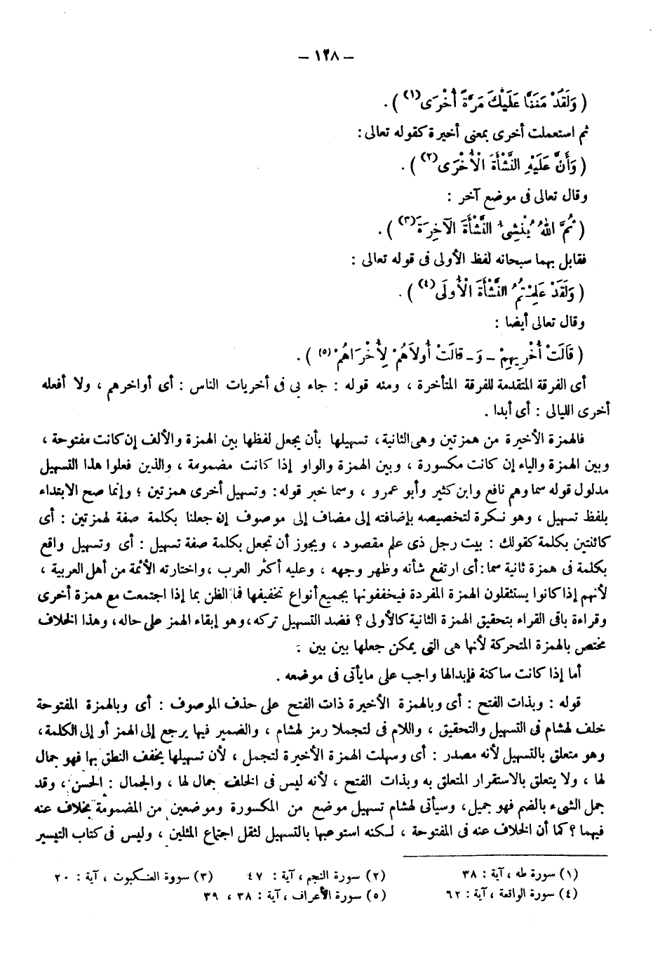{وَلَقَدْ مَنَنَّا عَلَيْكَ مَرَّةً أُخْرَى} 1، ثم استعملت أخرى بمعنى أخيرة كقوله تعالى: {وَأَنَّ عَلَيْهِ النَّشْأَةَ الْأُخْرَى} 2. وقال تعالى في موضع آخر: {ثُمَّ اللَّهُ يُنْشِئُ النَّشْأَةَ الْآخِرَةَ} 3. فقابل بهما سبحانه لفظ الأولى في قوله تعالى: {وَلَقَدْ عَلِمْتُمُ النَّشْأَةَ الْأُولَى} 4. وقال تعالى أيضا: "قالت أُخْرِيهم" و: {قَالَتْ أُولاهُمْ لِأُخْرَاهُمْ} 5. أي الفرقة المتقدمة للفرقة المتأخرة، ومنه قوله: جاء بي في أخريات الناس أي أواخرهم ولا أفعله أخرى الليالي أي أبدا.