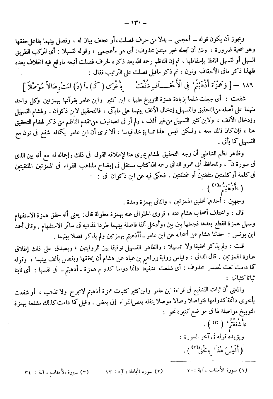 وظاهر نظم الشاطبي أن وجه التحقيق لهشام يجري هنا لإطلاقه القول في ذلك وإجماله له مع أنه بين الذي في سورة ن وللحافظ أبي عمرو الداني -رحمه الله- كتاب مستقل في إيضاح مذاهب القراء في الهمزتين الملتقيتين في كلمة أو كلمتين متفقتين أو مختلفتين فحكى فيه عن ابن ذكوان في: {أَذْهَبْتُمْ} 1 وجهين: أحدهما تحقيق الهمزتين، والثاني بهمزة ومدة.