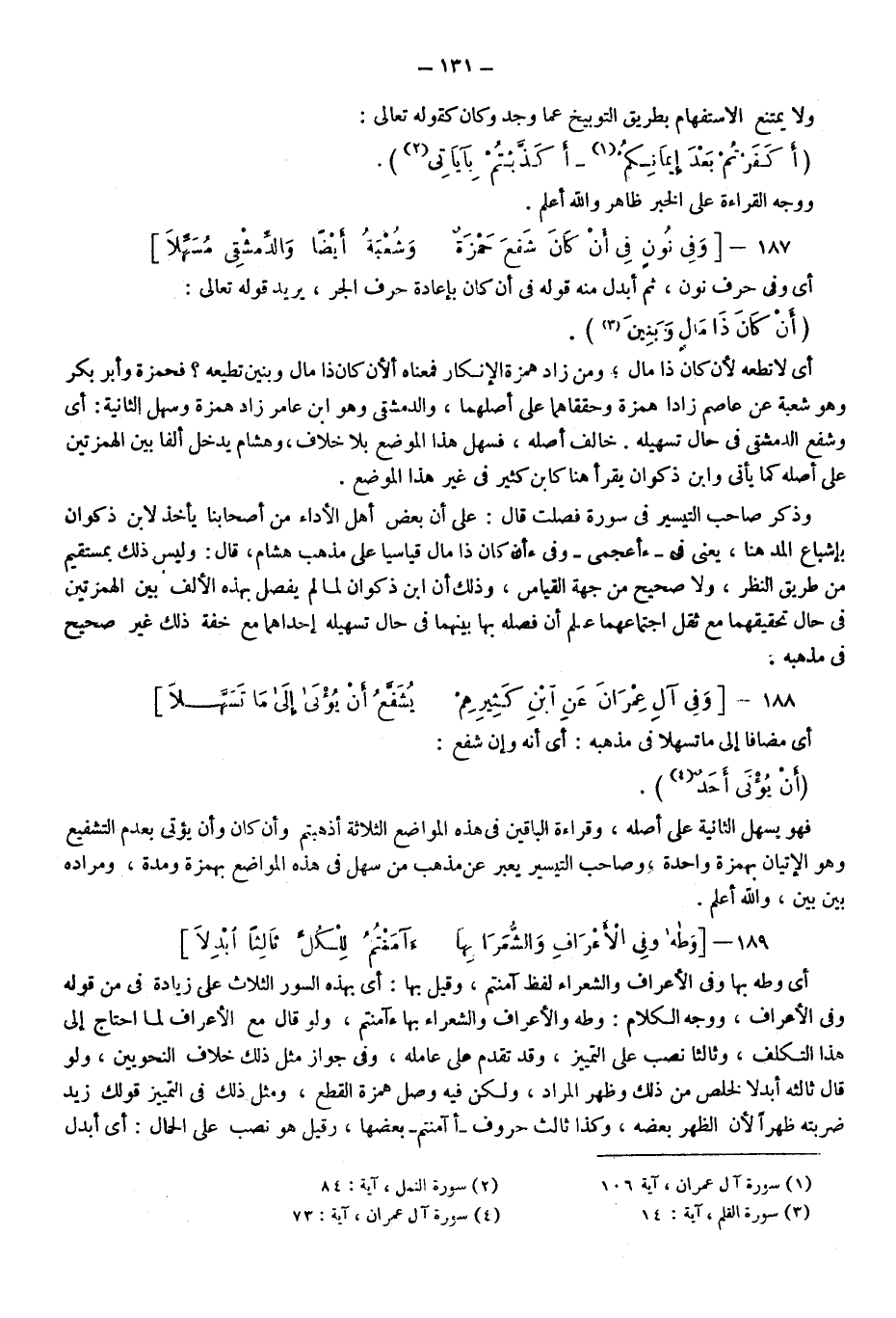 فهو يسهل الثانية على أصله وقراءة الباقين في هذه المواضع الثلاثة أذهبتم وأن كان وأن يؤتى بعدم التشفيع وهو الإتيان بهمزة واحدة وصاحب التيسير يعبر عن مذهب من سهل في هذه المواضع بهمزة ومدة ومراده بين بين والله أعلم.