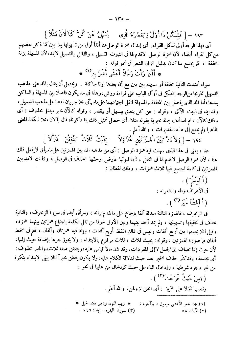 وَلاَ مَدَّ بَيْنَ الْهَمْزَتَيْنِ هُنَا وَلا ... بِحَيْثُ ثَلاَثٌ يَتَّفِقْنَ تَنَزُّلا