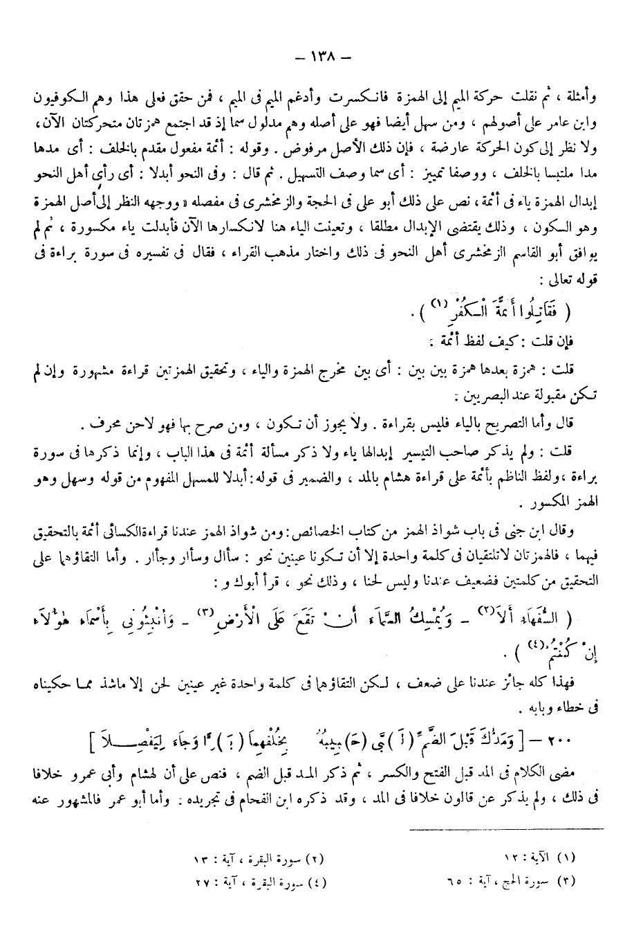 وقال ابن جنى في باب شواذ الهمز من كتاب الخصائص: ومن شواذ الهمز عندنا قراءة الكسائي أئمة بالتحقيق فيهما، فالهمزتان لا تلتقيان في كلمة واحدة إلا أن تكونا عينين نحو: سأال وسأار وجأار، وأما التقاؤهما على التحقيق من كلمتين فضعيف عندنا وليس لحنا، وذلك نحو قرأ أبوك و: "السُّفَهَاءُ أَلا"2، {وَيُمْسِكُ السَّمَاءَ أَنْ تَقَعَ عَلَى الْأَرْضِ} 3، {أَنْبِئُونِي بِأَسْمَاءِ هَؤُلَاءِ إِنْ كُنْتُمْ} 4.