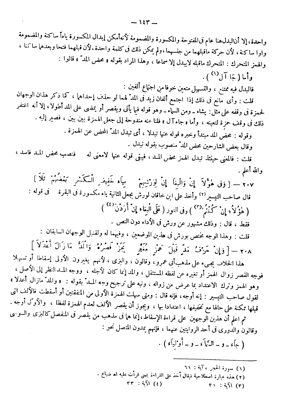 قلت: وأي مانع في ذلك إذا اجتمع ألفان زيد في المد لهما لو حذف إحداهما كما ذُكر هذان الوجهان لحمزة في وقفه على مثل "يشاء" و"من السماء" وهو قوله فيما يأتي: ويقصر أو يمضي على المد أطولا إلا أنه اغتفر ذلك في وقف حمزة؛ لتعينه وأما "جاء آل" فلنا عنه مندوحة إلى جعل الهمزة بين بين فصير إليه.