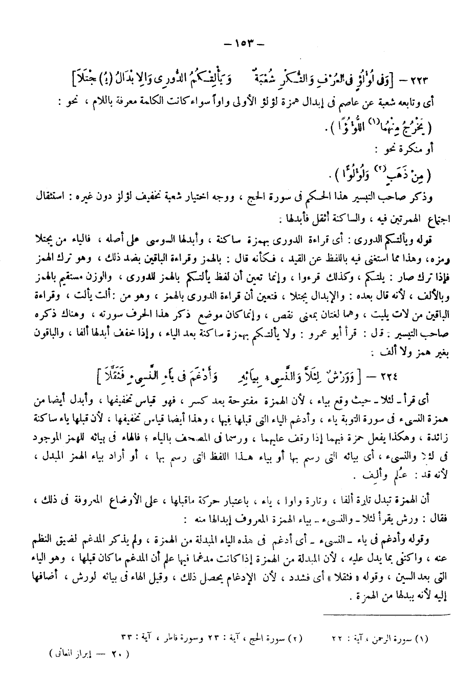 أن الهمزة تبدل تارة ألفا، وتارة واوا، ياء باعتبار حركة ما قبلها على الأوضاع المعروفة في ذلك فقال ورش يقرأ: "لئلا"، و"النسيء" بياء الهمزة المعروف إبدالها منه.