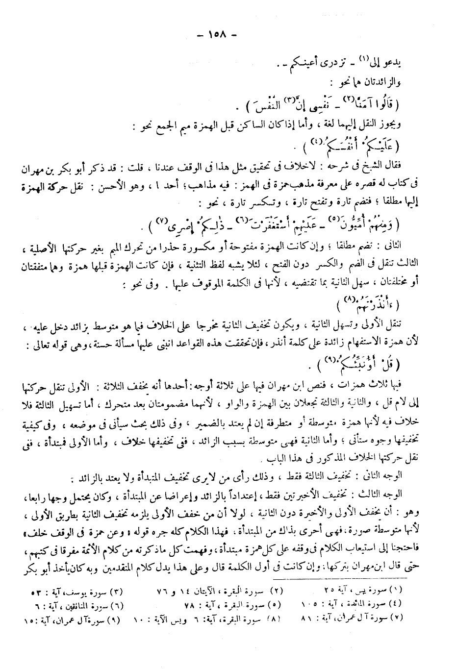 فقال الشيخ في شرحه: لا خلاف في تحقيق مثل هذا في الوقف عندنا. قلت: قد ذكر أبو بكر بن مهران في كتاب له قصره على معرفة مذهب حمزة في الهمز فيه مذاهب أحدها -وهو الأحسن: نقل حركة الهمزة إليها مطلقا فتضم تارة وتفتح تارة وتكسر تارة نحو: {وَمِنْهُمْ أُمِّيُّونَ} 5، {عَلَيْهِمْ أَسْتَغْفَرْتَ} 6، {ذَلِكُمْ إِصْرِي} 7.