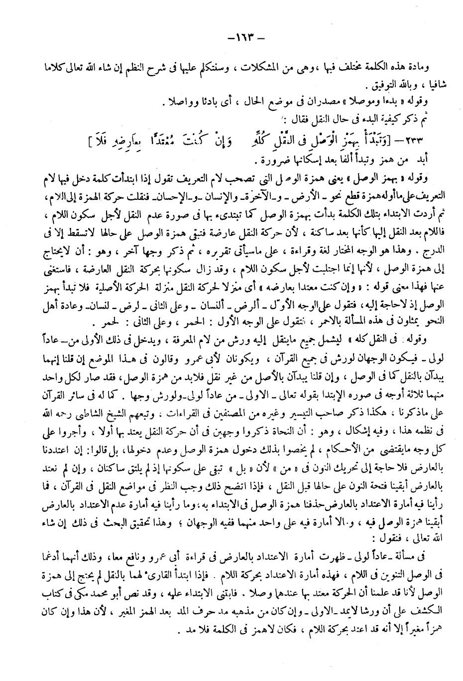 وقوله: في النقل كله؛ ليشمل جميع ما ينقل إليه ورش من لام المعرفة، ويدخل في ذلك الُأولى من "عادا الُاولى"، فيكون الوجهان لورش في جميع القرآن، ويكونان لأبي عمرو وقالون في هذا الموضع إن قلنا إنهما يبدآن بالنقل كما في الوصل، وإن قلنا يبدآن بالأصل من غير نقل فلا بد من همزة الوصل، فقد صار لكل واحد منهما ثلاثة أوجه في صوره؛ الإبتدا بقوله تعالى "الُاولى" من "عادا الُاولى" ولورش وجها. كما له في سائر القرآن على ما ذكرنا، هكذا ذكر صاحب التيسير وغيره من المصنفين في القراءات وتبعهم الشيخ الشاطبي -رحمه الله- في نظمه هذا، وفيه إشكال وهو أن النحاة ذكروا وجهين في أن حركة النقل يعتد بها أولا، وأجروا على كل وجه ما يقتضي من الأحكام لم يخصوا بذلك دخول همزة الوصل وعدم دخولها بل قالوا: إن اعتدنا بالعارض فلا حاجة إلى تحريك النون في "من"؛ لأن "بل" تبقى على سكونها؛ إذ لم يلتق ساكنان، وإن لم نعتد بالعارض أبقينا فتحة النون على حالها قبل النقل فإذا اتضح ذلك وجب النظر في مواضع النقل في القرآن فما رأينا فيه أمارة الاعتداد بالعارض حذفنا همزة الوصل في الابتداء به، وما رأينا فيه أمارة عدم الاعتداد بالعارض أبقينا همزة الوصل فيه وما لا أمارة فيه على واحد منهما ففيه الوجهان وهذا تحقيق البحث في ذلك إن شاء الله تعالى، فنقول: