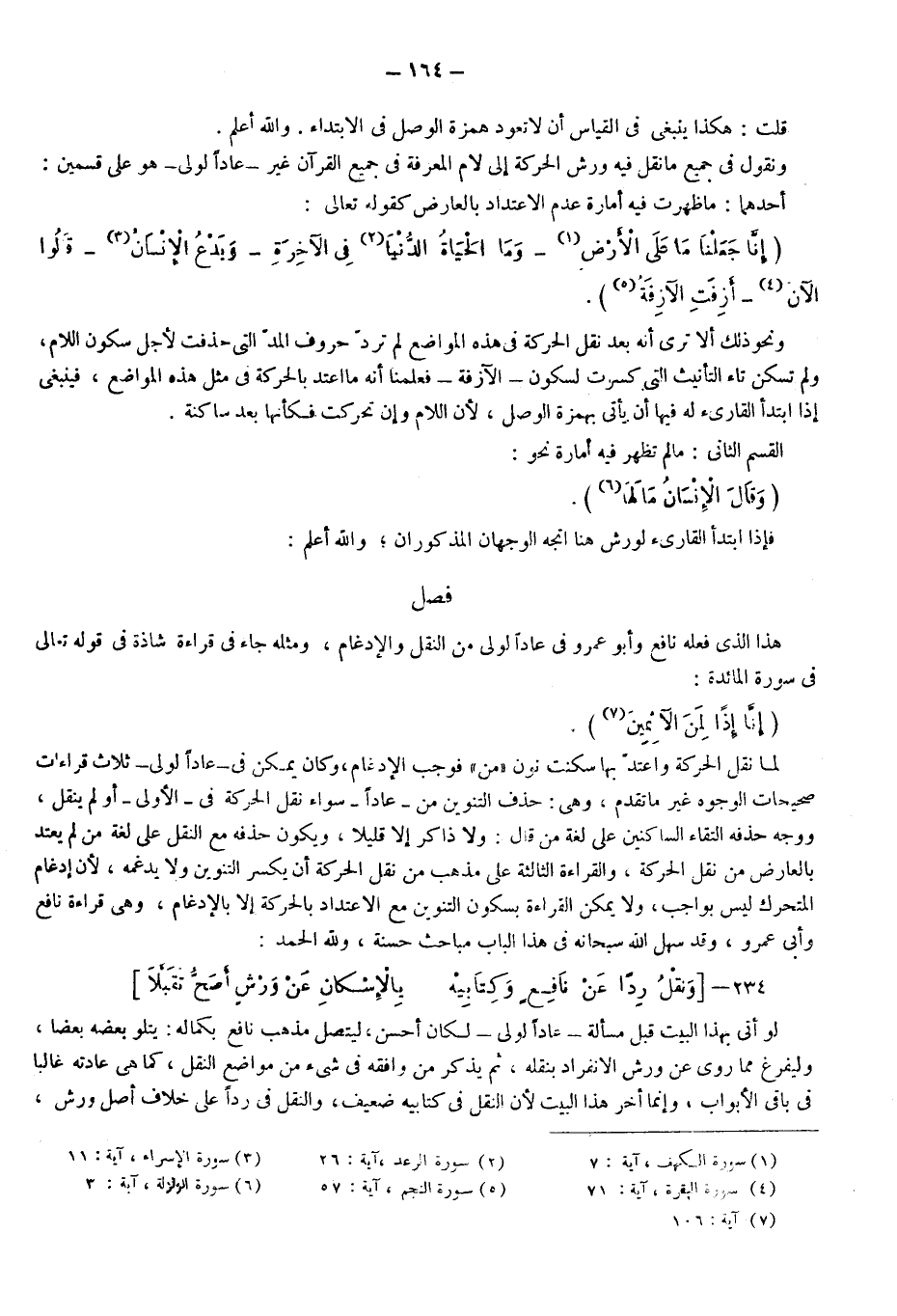 ونقول في جميع ما نقل فيه ورش الحركة إلى لام المعرفة في جميع القرآن غير "عادا الُاولى" هو على قسمين، أحدهما ما ظهرت فيه أمارة عدم الاعتداد بالعارض كقوله تعالى: {إِنَّا جَعَلْنَا مَا عَلَى الْأَرْضِ} 1، {وَمَا الْحَيَاةُ الدُّنْيَا 2 فِي الْآخِرَةِ} ، {وَيَدْعُ الْإِنْسَانُ} 3، {قَالُوا الْآنَ} 4، {أَزِفَتِ الْآزِفَةُ} 5.