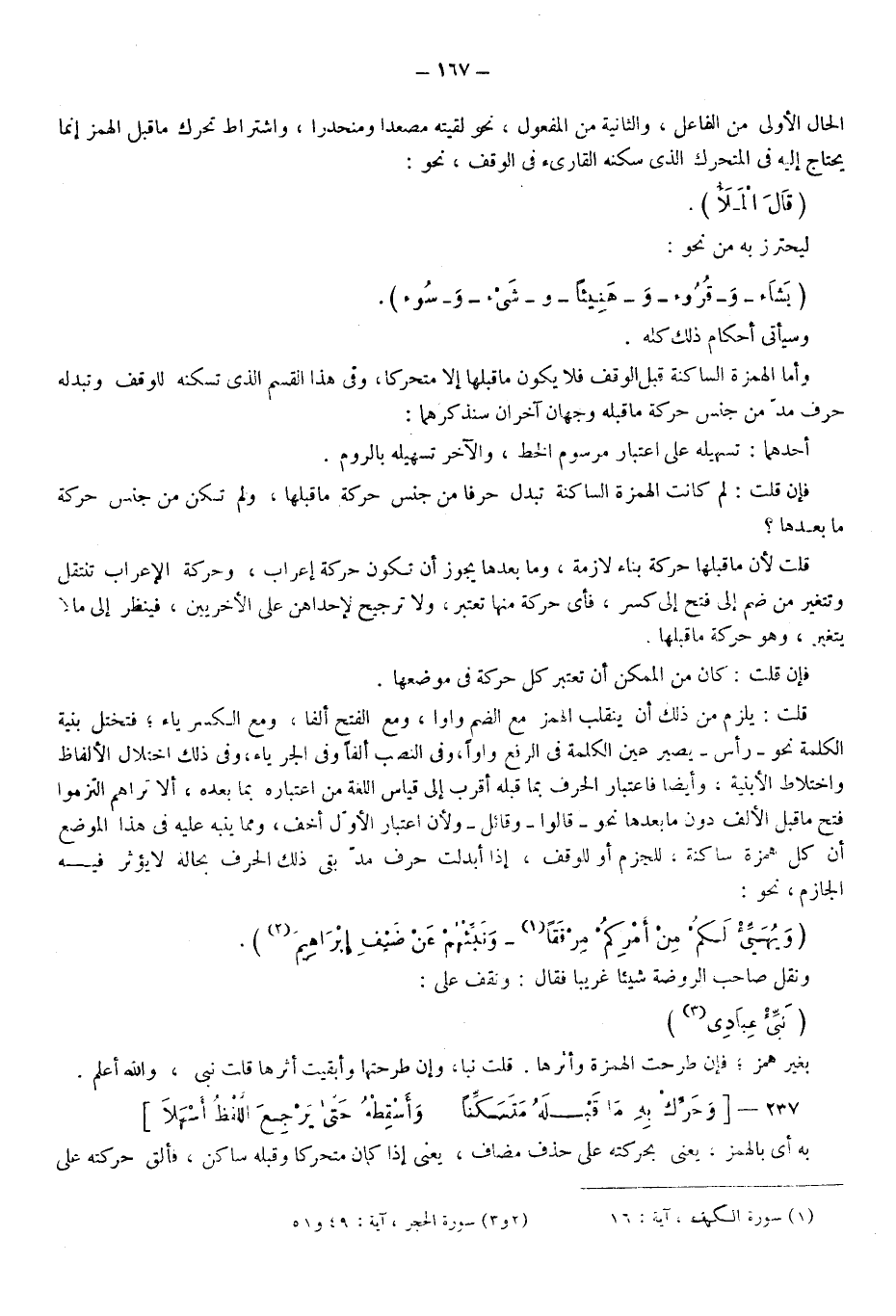 قلت: يلزم من ذلك أن ينقلب الهمز مع الضم واوا، ومع الفتح ألفا، ومع الكسر ياء، فتختل بنية الكلمة نحو رأس يصير عين الكلمة في الرفع واوا، وفي النصب ألفا، وفي الجر ياء، وفي ذلك اختلال الألفاظ واختلاط الأبنية وأيضا فاعتبار الحرف بما قبله أقرب إلى قياس اللغة من اعتباره بما بعده، ألا تراهم التزموا فتح ما قبل الألف دون ما بعدها نحو قالوا وقائل، ولأن اعتبار الأول أخف، ومما ينبه عليه في هذا الموضع أن كل همزة ساكنة للجزم أو للوقف إذا أبدلت حرف مد بقي ذلك الحرف بحاله لا يؤثر فيه الجازم نحو: {وَيُهَيِّئْ لَكُمْ مِنْ أَمْرِكُمْ مِرْفَقًا} 1، {وَنَبِّئْهُمْ عَنْ ضَيْفِ إِبْرَاهِيمَ} 2.