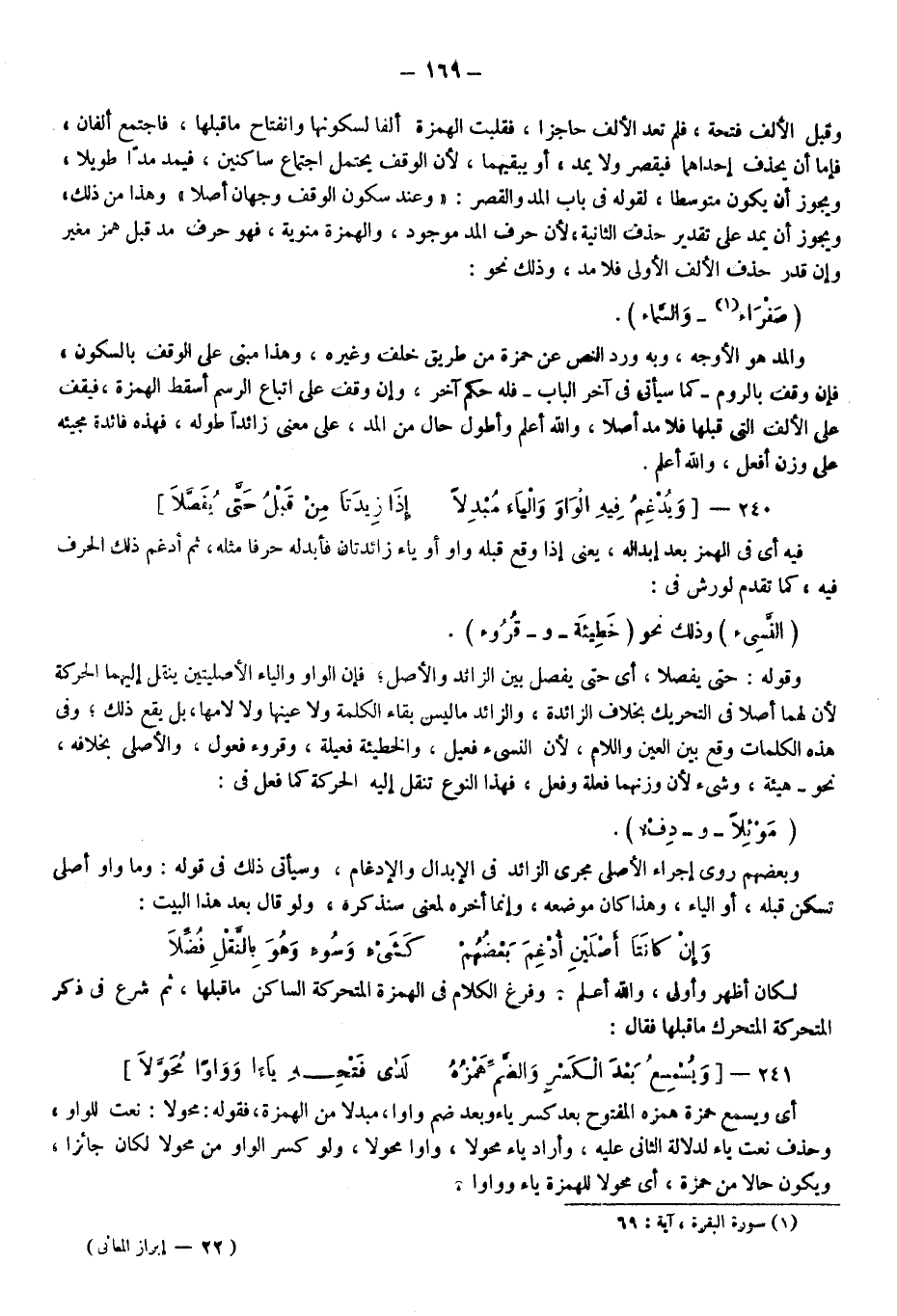 وقبل الألف فتحة فلم تعد الألف حاجزا فقلبت الهمزة ألفا لسكونها وانفتاح ما قبلها فاجتمع ألفان فإما أن يحذف إحداهما فيقصر ولا يمد أو يبقيهما؛ لأن الوقف يحتمل اجتماع ساكنين فيمد مدًّا طويلًا ويجوز أن يكون متوسطا لقوله في باب المد والقصر: "وعند سكون الوقف وجهان أصلا" وهذا من ذلك ويجوز أن يمد على تقدير حذف الثانية؛ لأن حرف المد موجود والهمزة منوية فهو حرف مد قبل همز مغير وإن قدر حذف الألف الأولى فلا مد وذلك نحو: {صَفْرَاءُ} 1، {وَالسَّمَاءَ} 2.