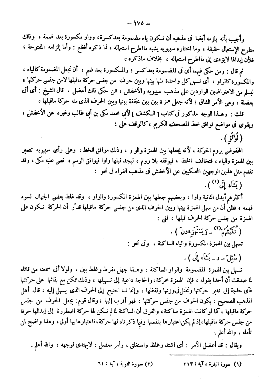 قلت: وهذا الوجه مذكور في كتاب الكشف لأبي محمد مكي بن أبي طالب وغيره عن الأخفش، ويقوى في مواضع توافق خط المصحف الكريم كالوقف على: "لؤلؤ" المخفوض بروم الحركة؛ لأنه يجعلها بين الهمزة والواو وذلك موافق للخط، وعلى رأي سيبويه تصير بين الهمزة والياء فتخالف الخط فيوقفه بلا روم ليجد قبلها واوًا فيوافق الرسم، نص عليه مكي، وقد تقدم مثل هذين الوجهين المحكيين عن الأخفش في مذهب الفراء في نحو: {يَشَاءُ إِلَى} 1؛ أكثرهم أبدل الثانية واوا وبعضهم جعلها بين الهمزة المكسورة والواو، وقد غلط بعض الجهال؛ لسوء فهمه فظن أن من سهل الهمزة بينها وبين الحرف الذي من جنس حركة ما قبلها قدر أن الحركة تكون على الهمزة من جنس حركة الحرف قبلها ففي: {تُنَبِّئُهُمْ} ، 2 و {يَسْتَهْزِئُونَ} تسهل بين الهمزة المكسورة والياء الساكنة وفي نحو: "سئل" و"يشاء إلى" تسهل بين الهمزة المضمومة والواو الساكنة وهذا جهل مفرط وغلط بيِّن، ولولا أني سمعته من قائله لما صدقت أن أحدا يقوله؛ فإن الهمزة محركة والحاجة داعية إلى تسهيلها، وذلك ممكن مع بقائها على حركتها فأي حاجة إلى تغير حركتها وتختل في وزنها ولفظها، وإنما لما احتيج إلى الحرف الذي يسهل إليه قال أهل المذهب الصحيح: يكون الحرف من جنس حركتها فهو أقرب إليها، وقال قوم: يجعل الحرف من جنس حركة ما قبلها كما لو كانت الهمزة ساكنة والفرق أن الساكنة لما لم تكن لها حركة اضطررنا إلى إبدالها حرفا من جنس حركة ما قبلها؛ إذ لم يكن اعتبارها بنفسها وفيما ذكرناه لها حركة فاعتبارها بها أولى، وهذا واضح لمن تأمله والله أعلم.