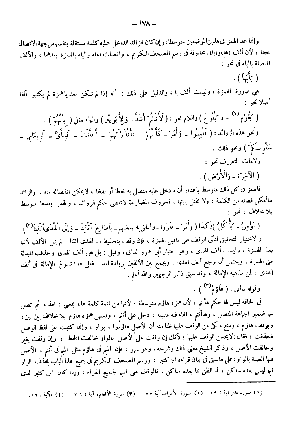 وإنما عد الهمز في هذين الموضعين متوسطا، وإن كان الزائد الداخل عليه كلمة مستقلة بنفسها من جهة الاتصال خطا؛ لأن ألف "ها" و "يا" محذوفة في رسم المصحف الكريم، واتصلت الهاء والياء بالهمزة بعدهما والألف المتصلة بالياء في نحو: "يأيها".