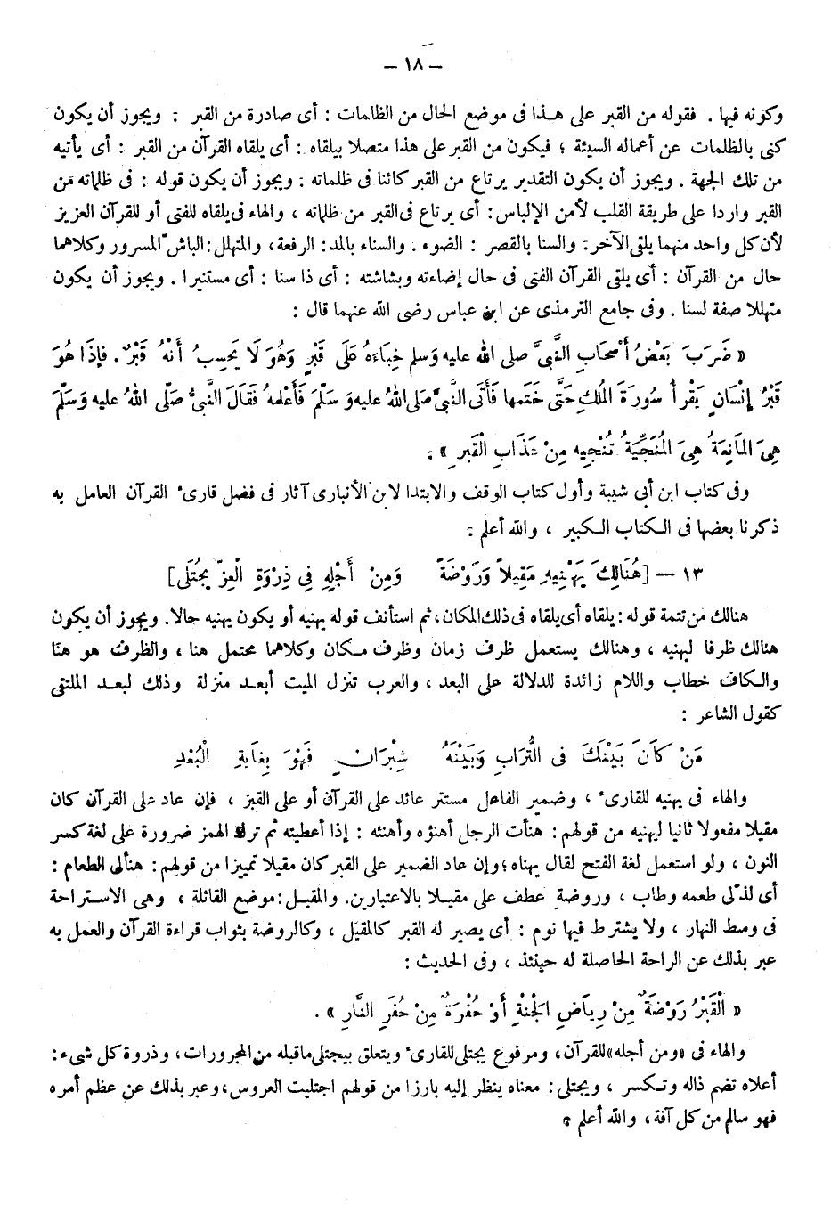 وكونه فيها، فقوله من القبر على هذا في موضع الحال من الظلمات أي صادرة من القبر، ويجوز أن يكون كنى بالظلمات عن أعماله السيئة فيكون من القبر على هذا متصلا بيلقاه أي يلقاه القرآن من القبر أي يأتيه من تلك الجهة، ويجوز أن يكون التقدير يرتاع من القبر كائنا في ظلماته، ويجوز أن يكون قوله في ظلماته من القبر واردا على طريقة القلب لأمن الإلباس أي يرتاع في القبر من ظلماته والهاء في يلقاه للفتى أو للقرآن العزيز؛ لأن كل واحد منهما يلقى الآخر، والسنا بالقصر الضوء، والسناء بالمد الرفعة والمتهلل الباش المسرور وكلاهما حال من القرآن أي يلقى القرآن الفتى في حال إضاءته وبشاشته أي ذا سنا أي مستنيرا، ويجوز أن يكون متهللا صفة لسنا، وفي جامع الترمذي عن ابن عباس -رضي الله عنهما- قال: