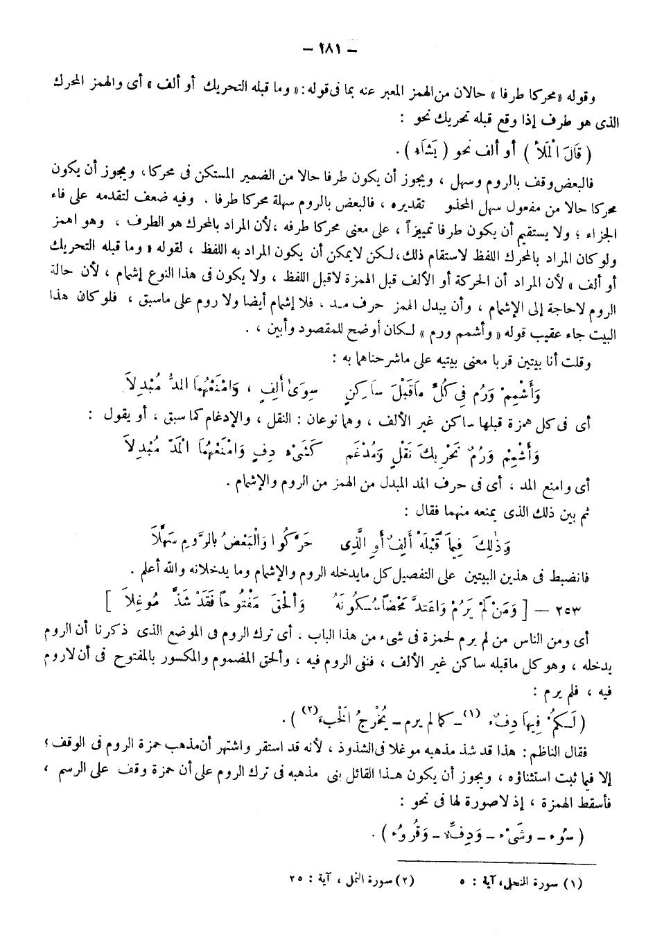 فقال الناظم: هذا قد شذ مذهبه موغلا في الشذوذ؛ لأنه قد استقر واشتهر أن مذهب حمزة الروم في الوقف إلا فيما ثبت استثناؤه، ويجوز أن يكون هذا القائل بنى مذهبه في ترك الروم على أن حمزة وقف على الرسم فأسقط الهمزة؛ إذ لا صورة لها في نحو: "سوء، وشيء، ودفء، وقروء".