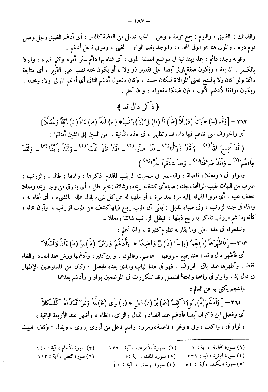 أي والحروف التي تدغم فيها دال "قد"، وتظهر في هذه الثمانية من السين إلى الشين أمثلتها: {قَدْ سَمِعَ اللَّهُ} 1، {وَلَقَدْ ذَرَأْنَا} 2، {قَدْ ضَلُّوا} 3، {فَقَدْ ظَلَمَ نَفْسَهُ} 4، {وَلَقَدْ زَيَّنَّا} 5، {وَلَقَدْ جَاءَهُمْ} 6، {وَلَقَدْ صَرَّفْنَا} 7، {قَدْ شَغَفَهَا حُبًّا} 8.