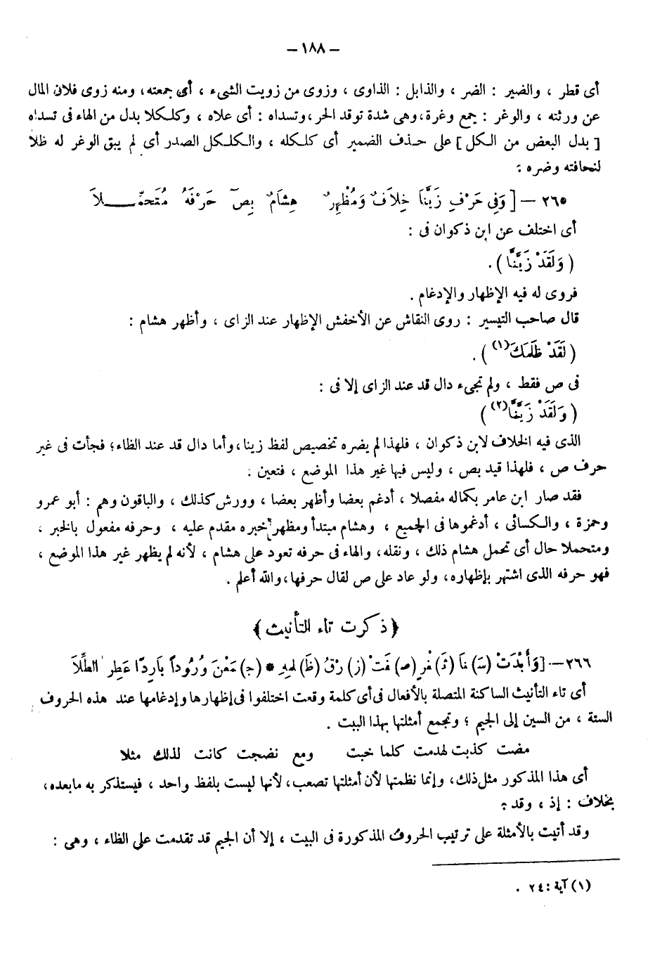 أي تاء التأنيث الساكنة المتصلة بالأفعال في أي كلمة وقعت اختلفوا في إظهارها وإدغامها عند هذه الحروف الستة من السين إلى الجيم وتجمع أمثلتها بهذا البيت: